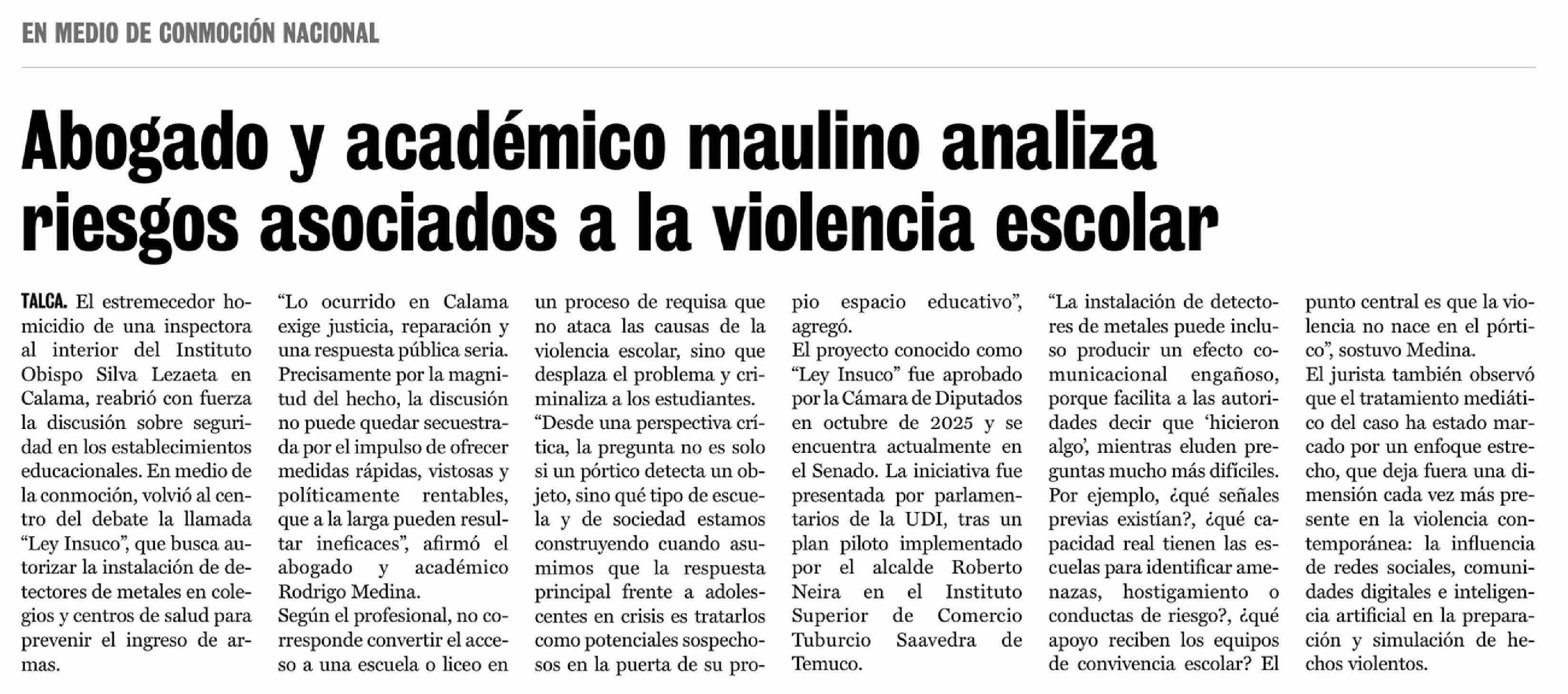 Abogado y académico maulino analiza riesgos asociados a la violencia escolar 31-03-2026 La Prensa de Curicó |
