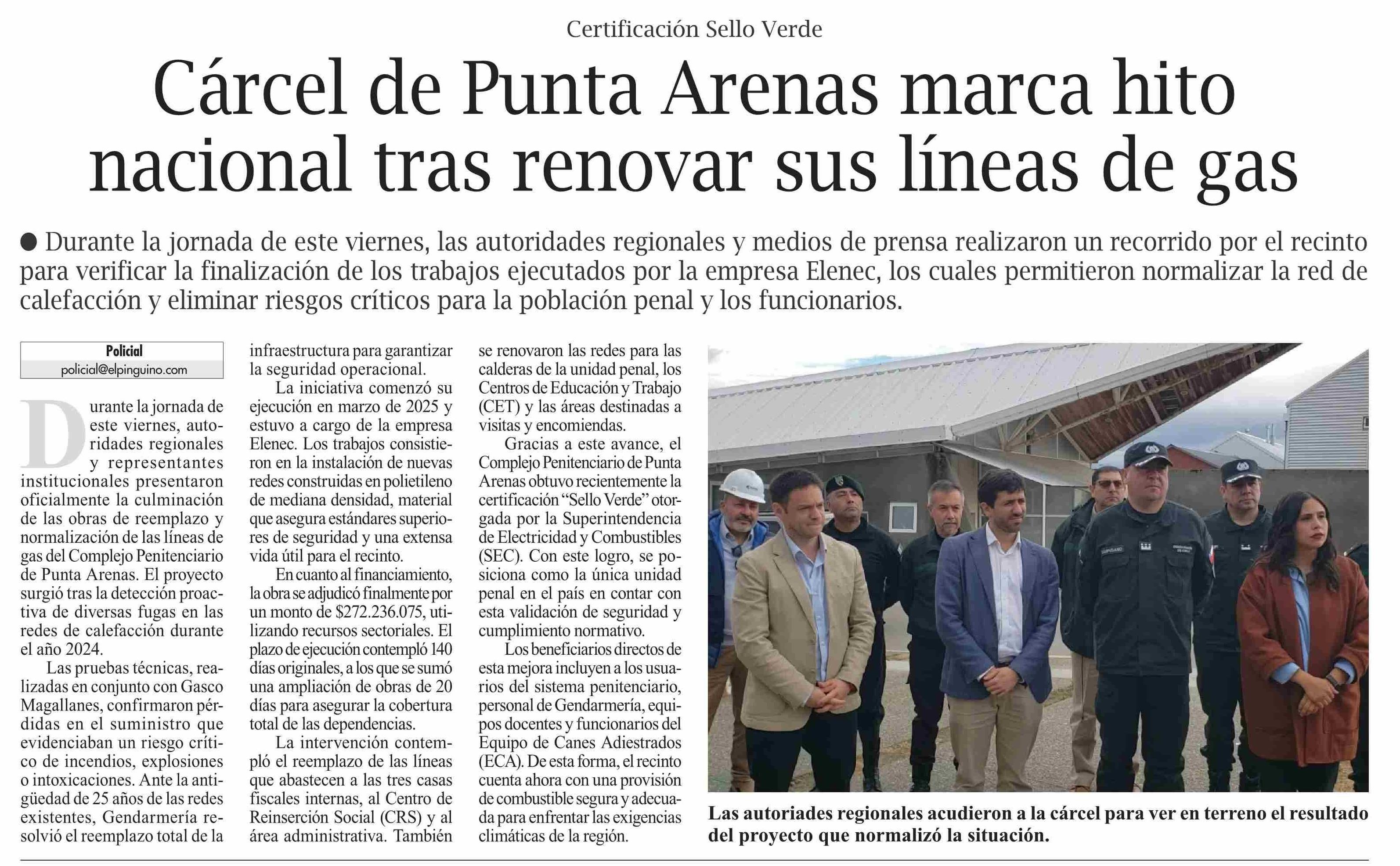 Título: Cárcel de Punta Arenas marca hito nacional tras renovar sus líneas de gas