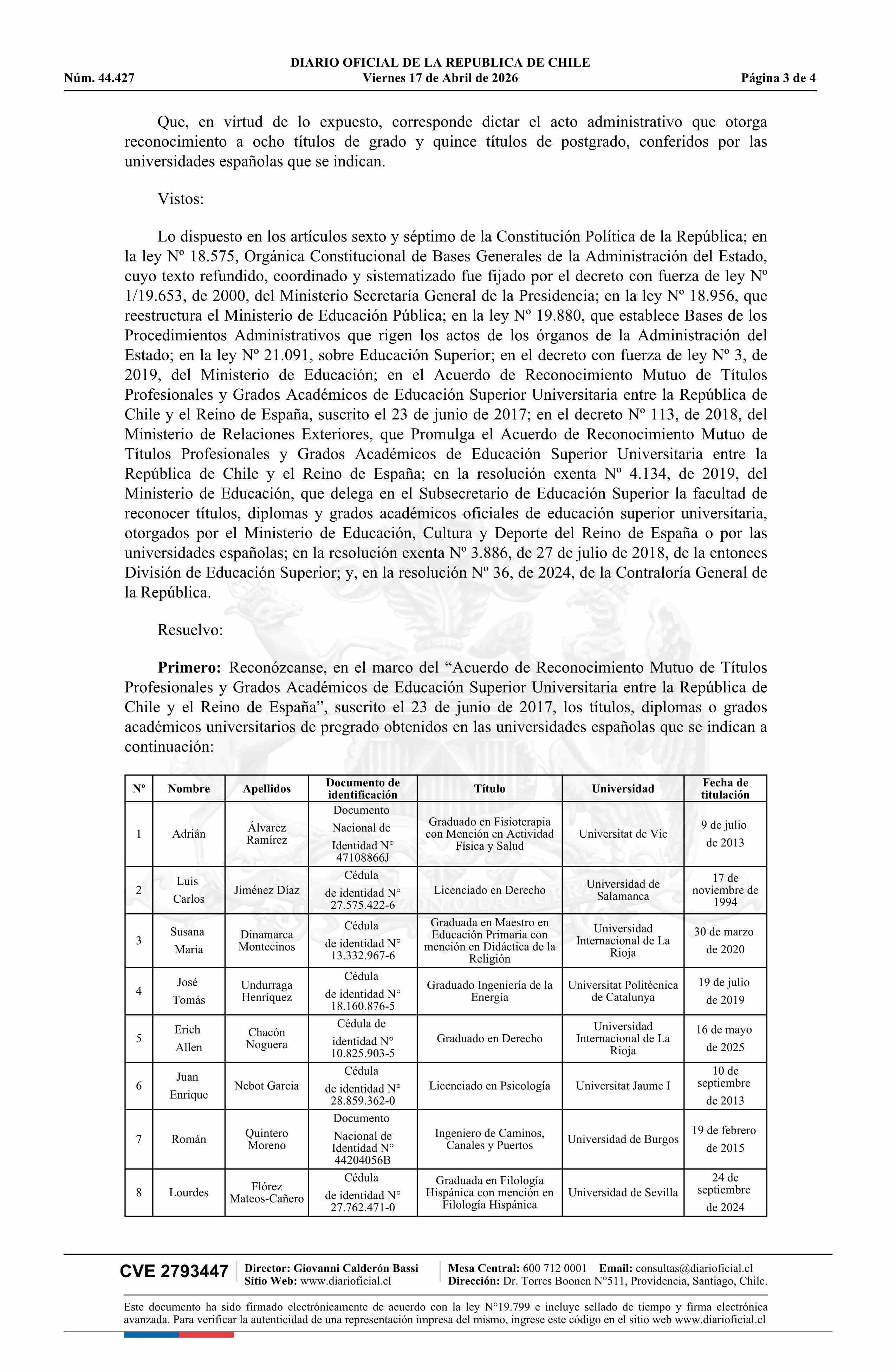 | Título: | Resolución exenta número 1.298, de 2026.- Reconoce títulos expedidos por universidades españolas que indica, en el marco del Acuerdo de Reconocimiento Mutuo de Títulos Profesionales y Grados Académicos de Educación Superior Universitaria entre la República de Chile y el Reino de España |
