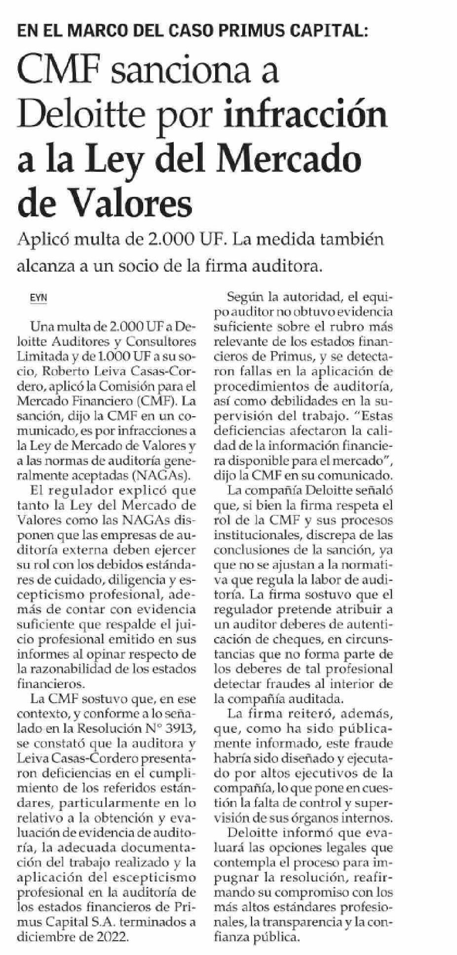Título: CMP sanciona a Deloitte por infracción a la Ley del Mercado de Valores