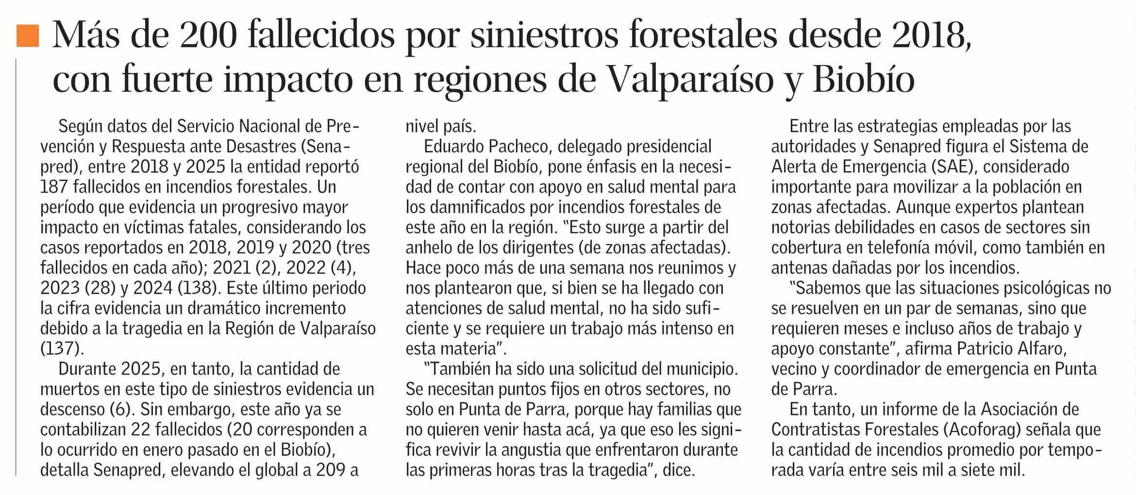 Título: N Más de 200 fallecidos por siniestros forestales desde 2018, con fuerte impacto en regiones de Valparaíso y Biobío