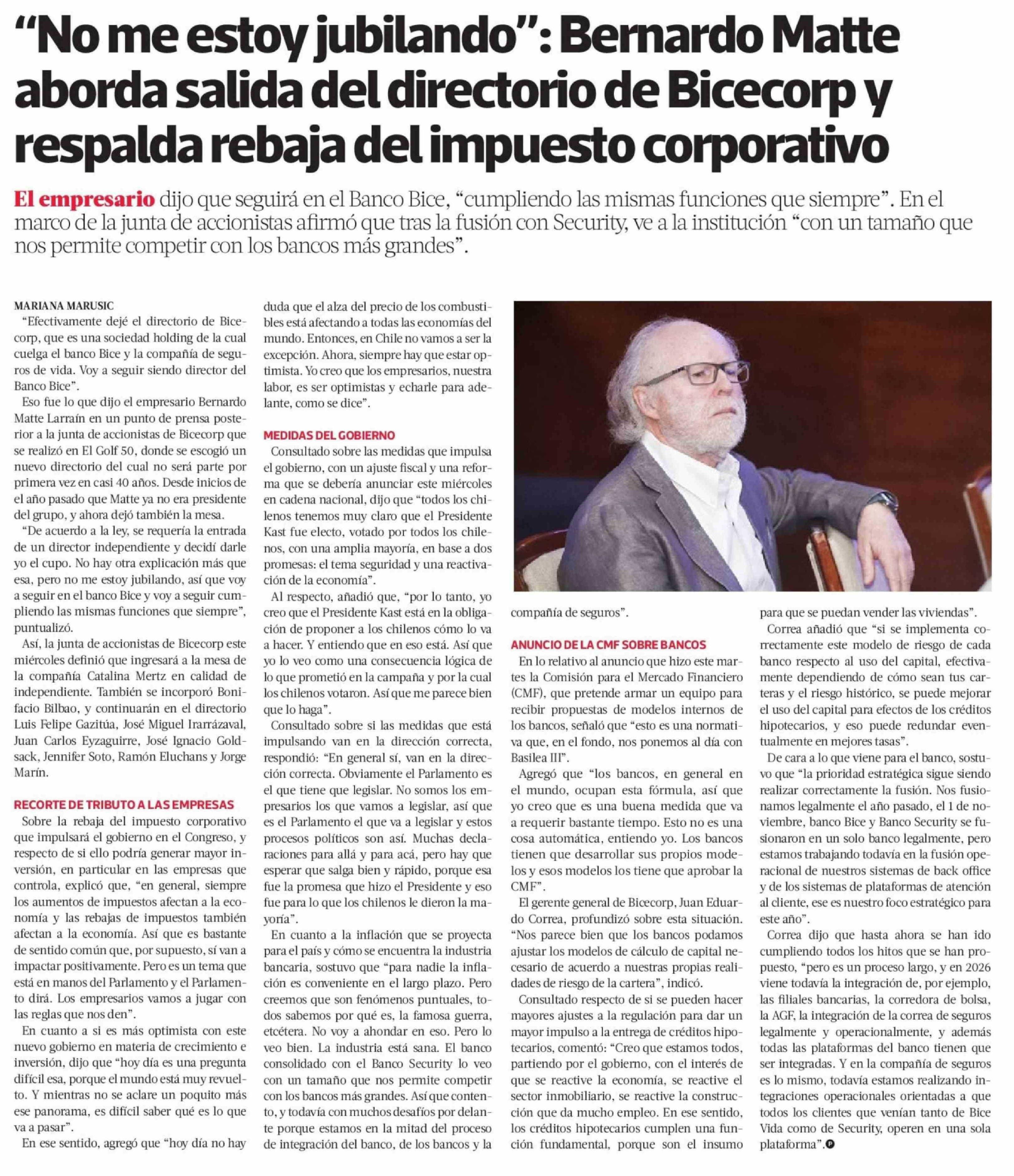Título: "No me estoy jubilando": Bernardo Matte aborda salida del directorio de Bicecorp y respalda rebaja del impuesto corporativo
