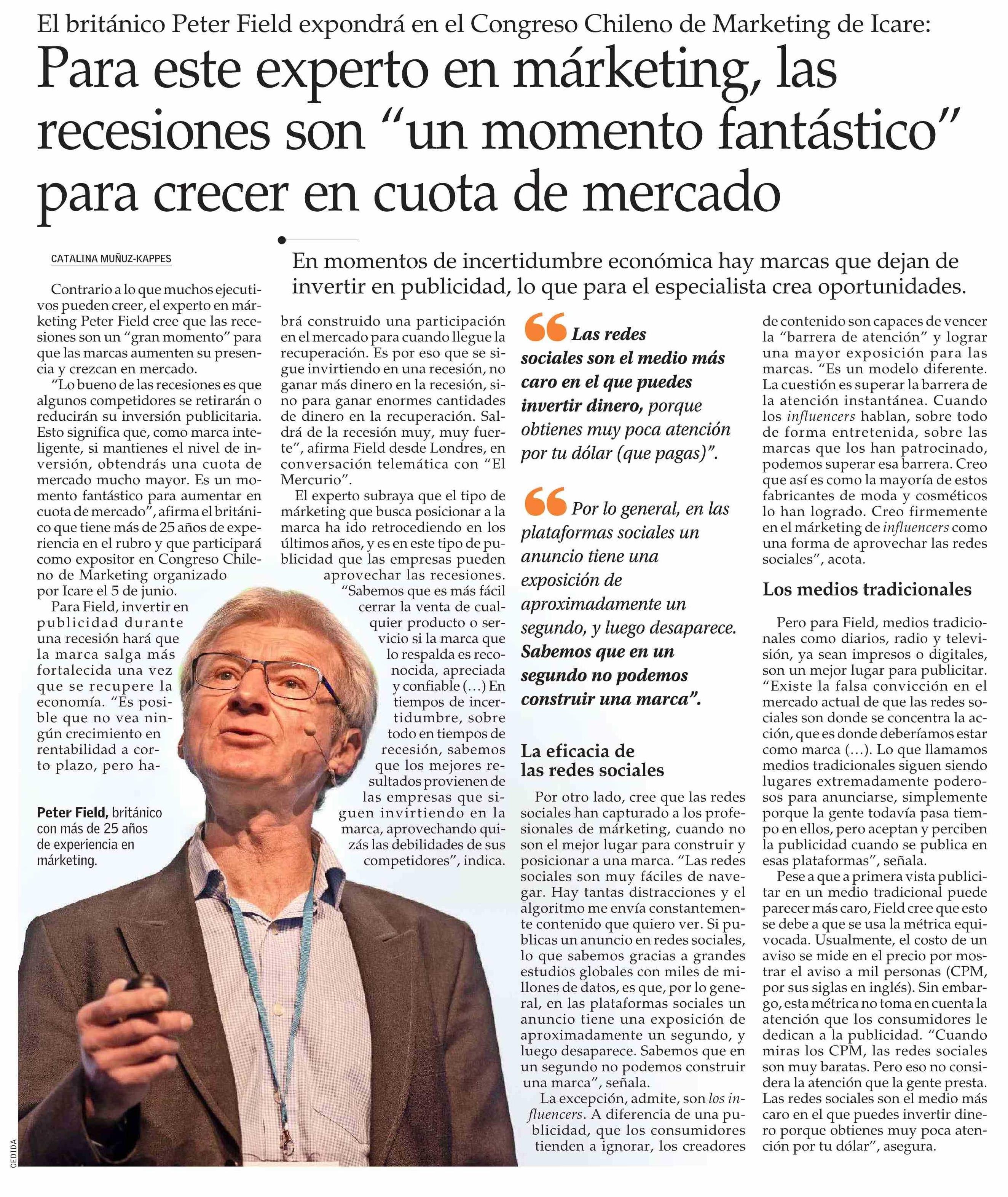Para este experto en márketing, las recesiones son “un momento fantástico” para crecer en cuota de mercado 29-05-2025 El Mercurio |