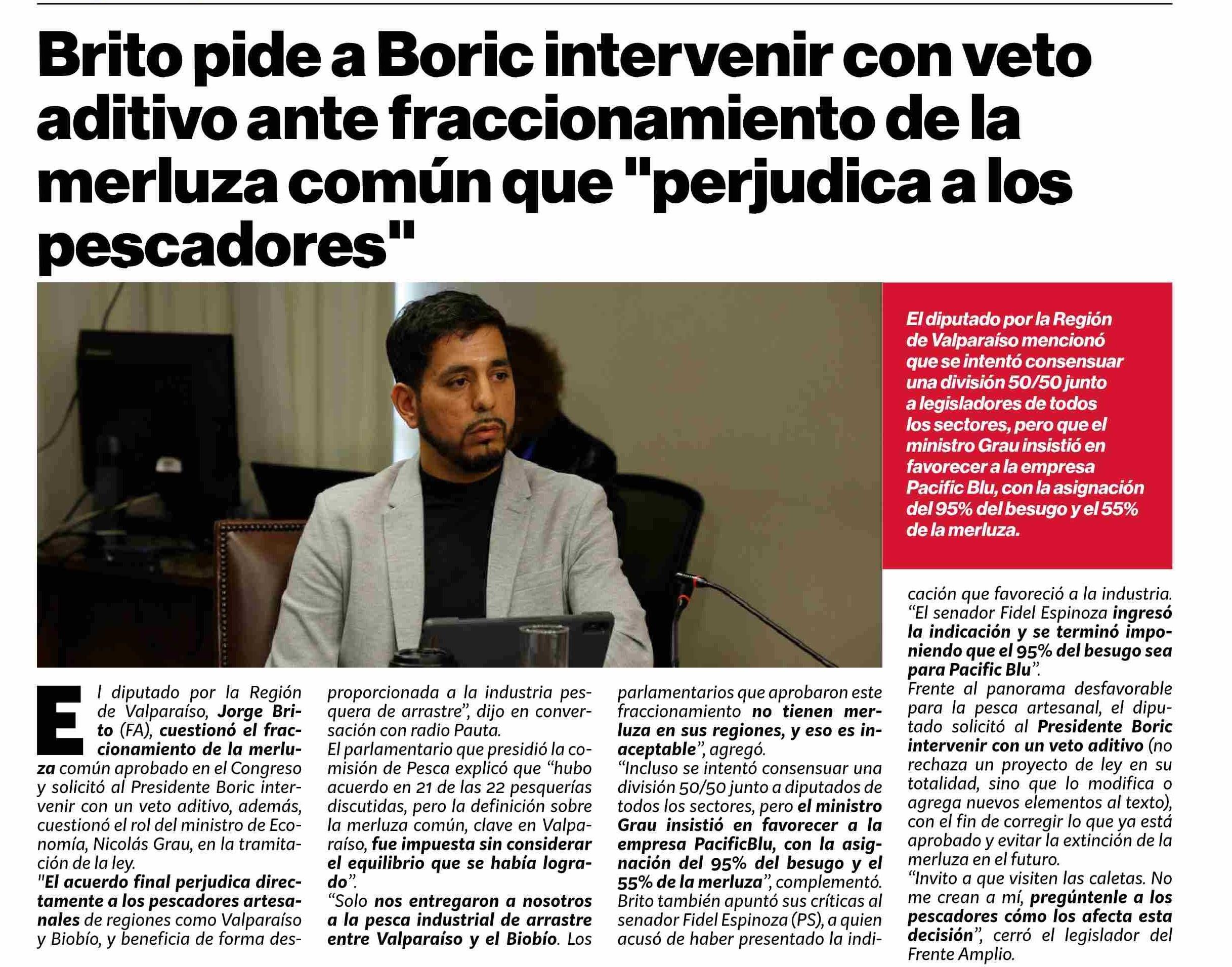 Brito pide a Boric intervenir con veto aditivo ante fraccionamiento de la merluza común que "perjudica alos pescadores” 11-06-2025 Puranoticia.cl |