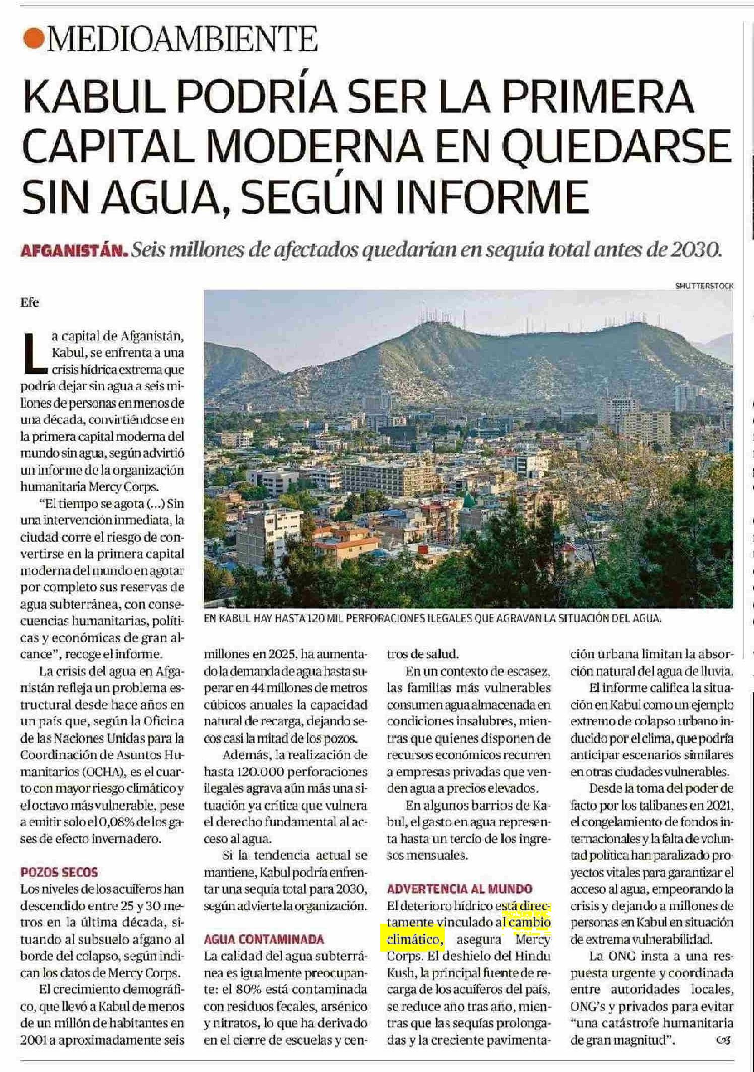 KABUL PODRÍA SER LA PRIMERA SIN AGUA, SEGÚN INFORME CAPITAL MODERNA EN QUEDARSE 09-06-2025 El Mercurio de Valparaíso |