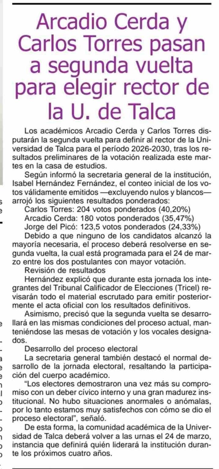 Título: Arcadio Cerda y Carlos Torres pasan a segunda vuelta para elegir rector de la U. de Talca