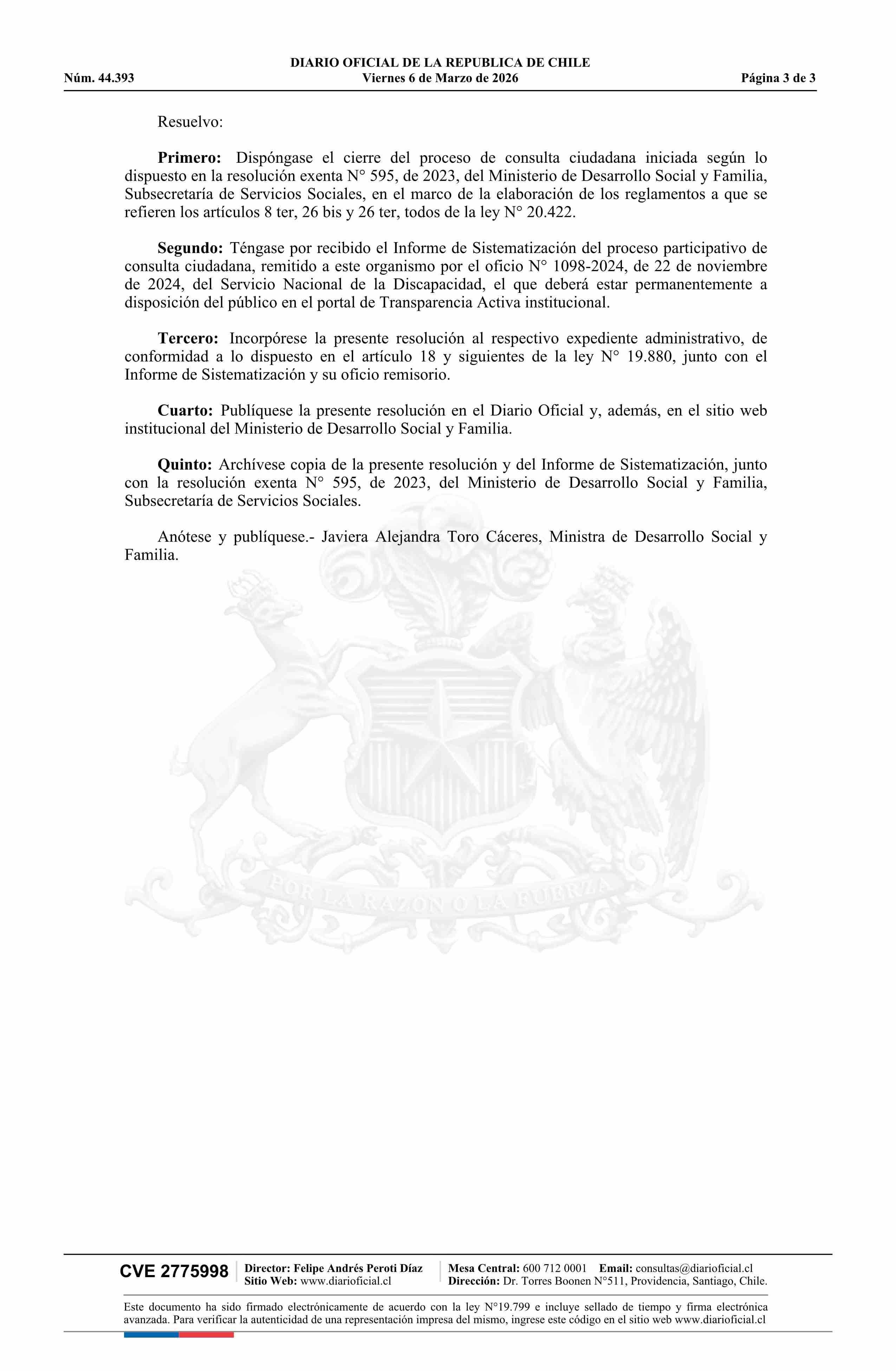 Resolución exenta número 135, de 2026.- Dispone el cierre del proceso de consulta ciudadana iniciada según lo dispuesto en la resolución N° 595 exenta, de 2023