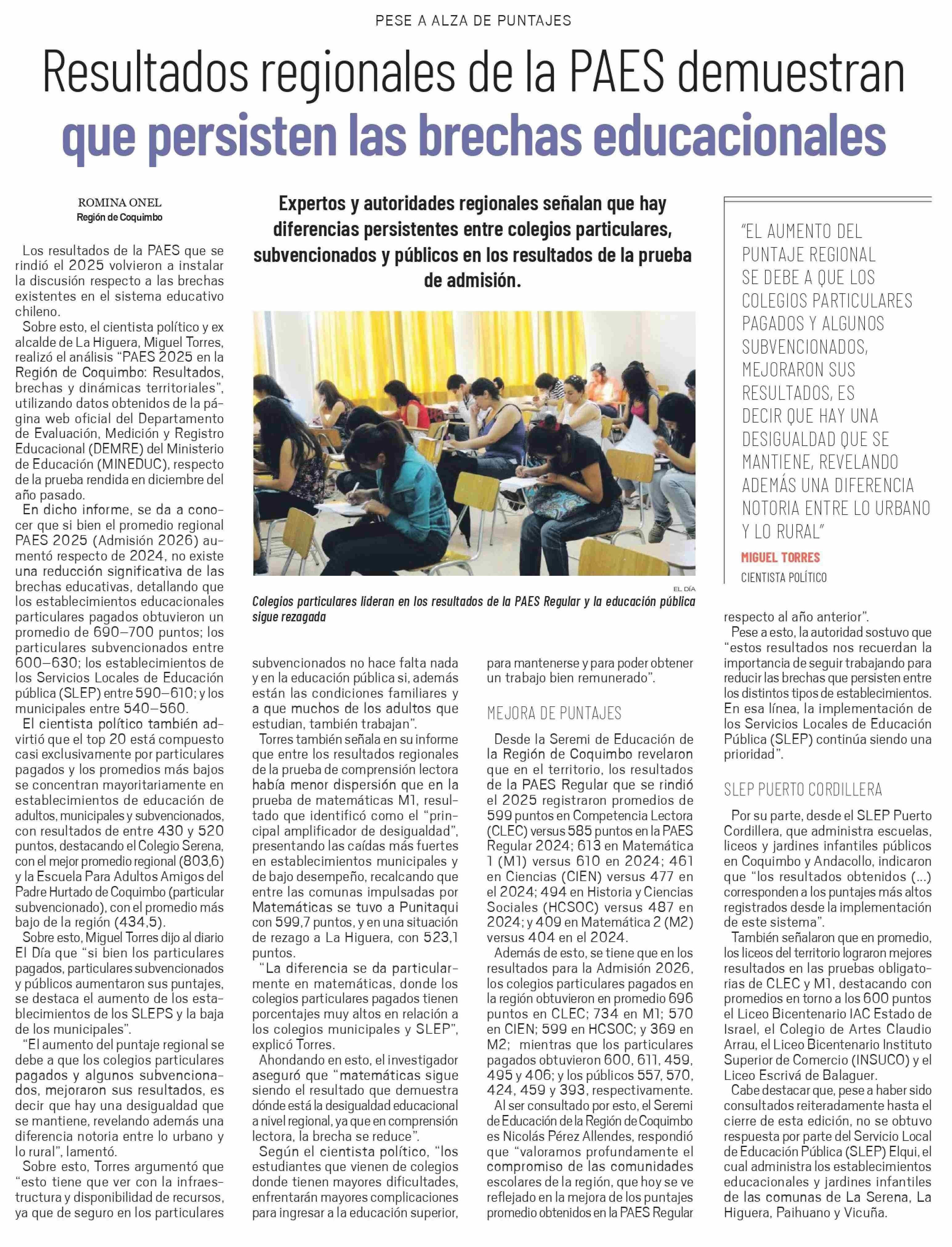 Resultados regionales de la PAES demuestran que persisten las brechas educacionales 18-01-2026 El Ovallino |