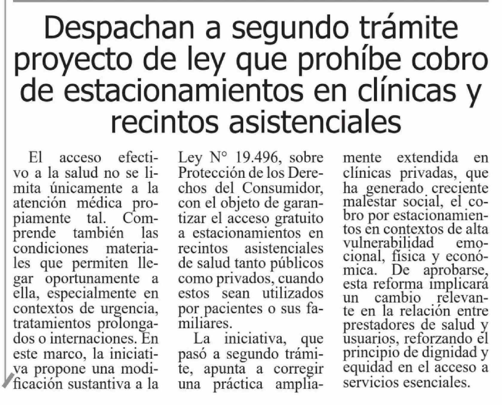 Despachan a segundo trámite proyecto de ley que prohíbe cobro de estacionamientos en clínicas y recintos asistenciales 04-03-2026 El Heraldo |