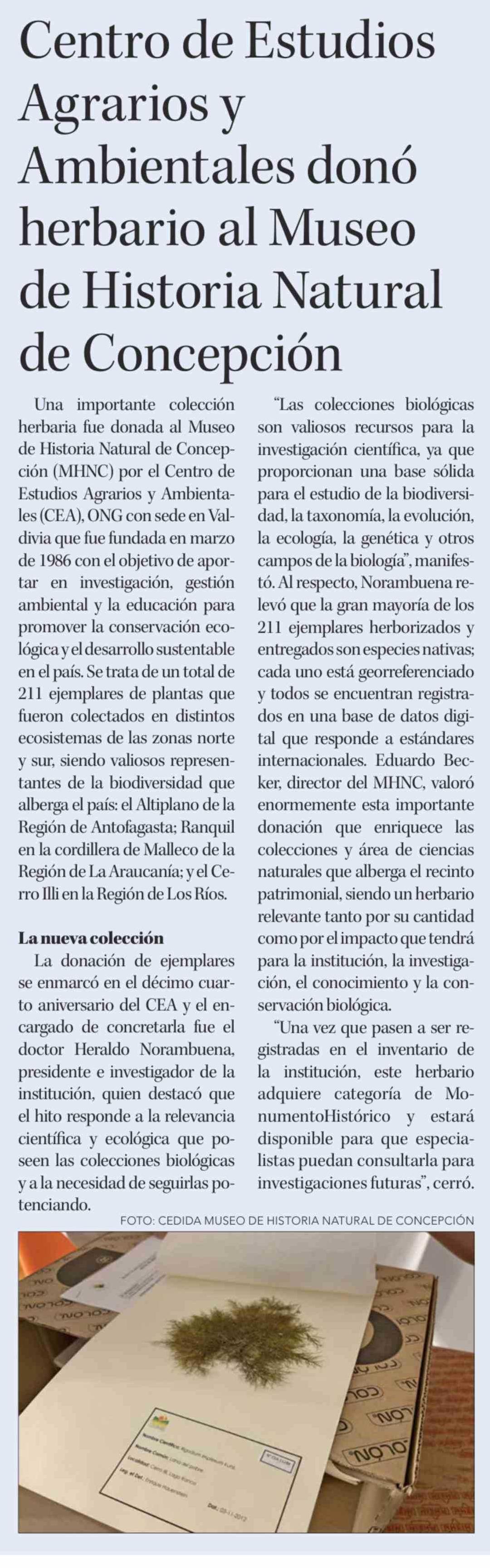 Centro de Estudios Agrarios y Ambientales donó herbario al Museo de Historia Natural de Concepción 04-04-2026 Diario Concepción |