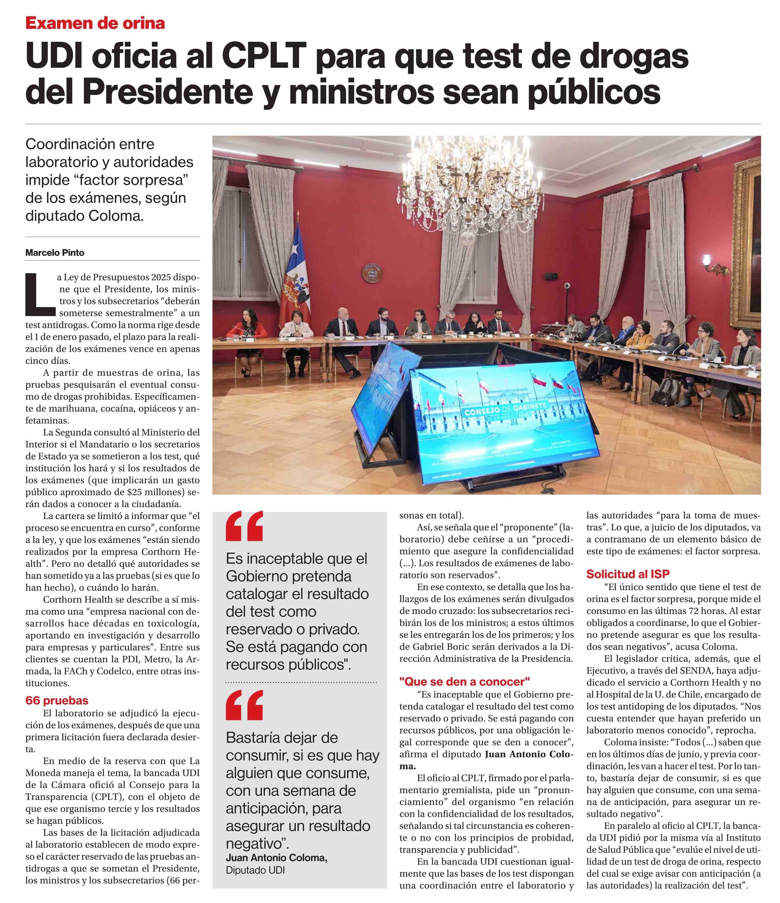 UDI oficia al CPLT para que test de drogas del Presidente y ministros sean públicos 25-06-2025 La Segunda |