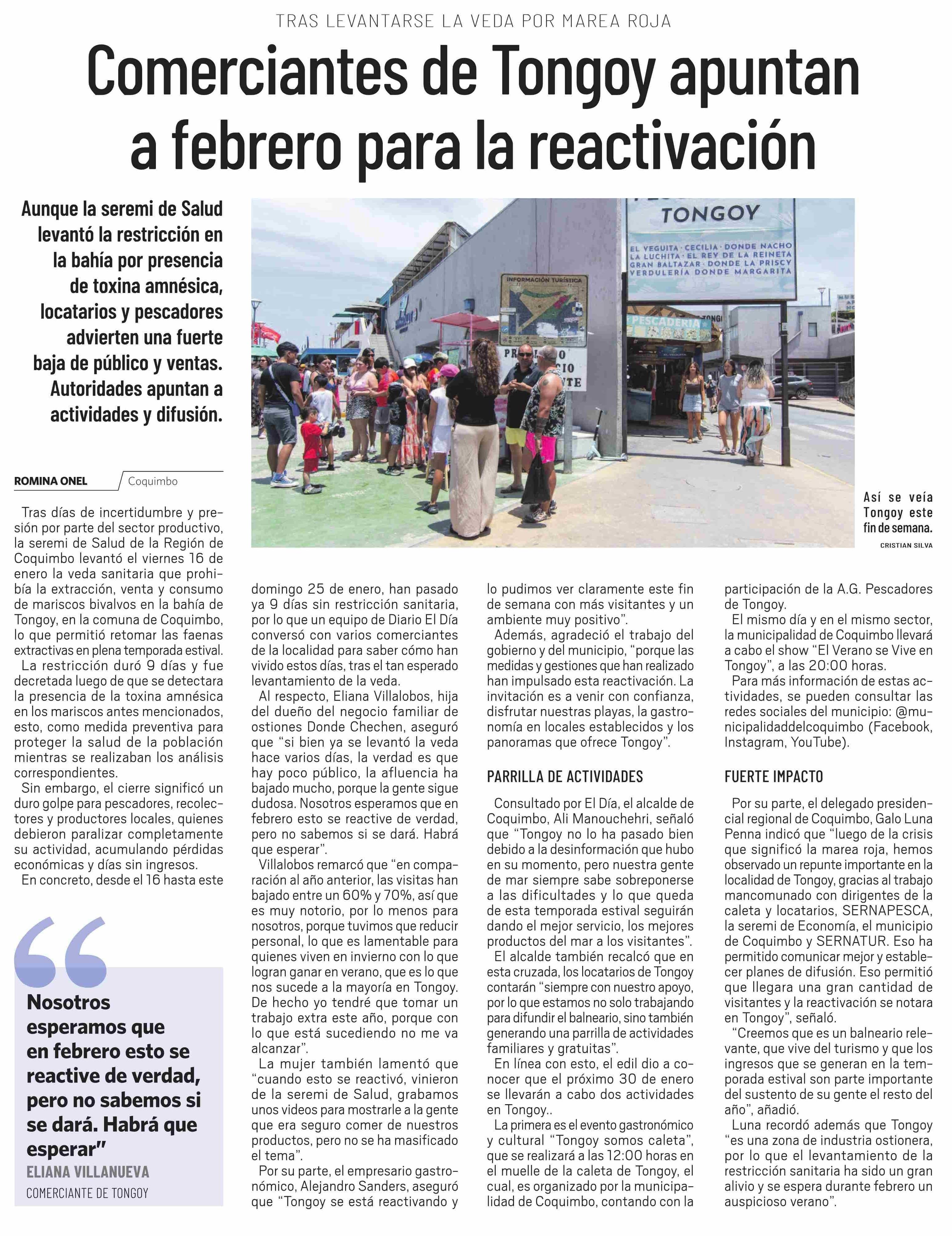 Comerciantes de Tongoy apuntan a febrero para la reactivación 26-01-2026 El Día |