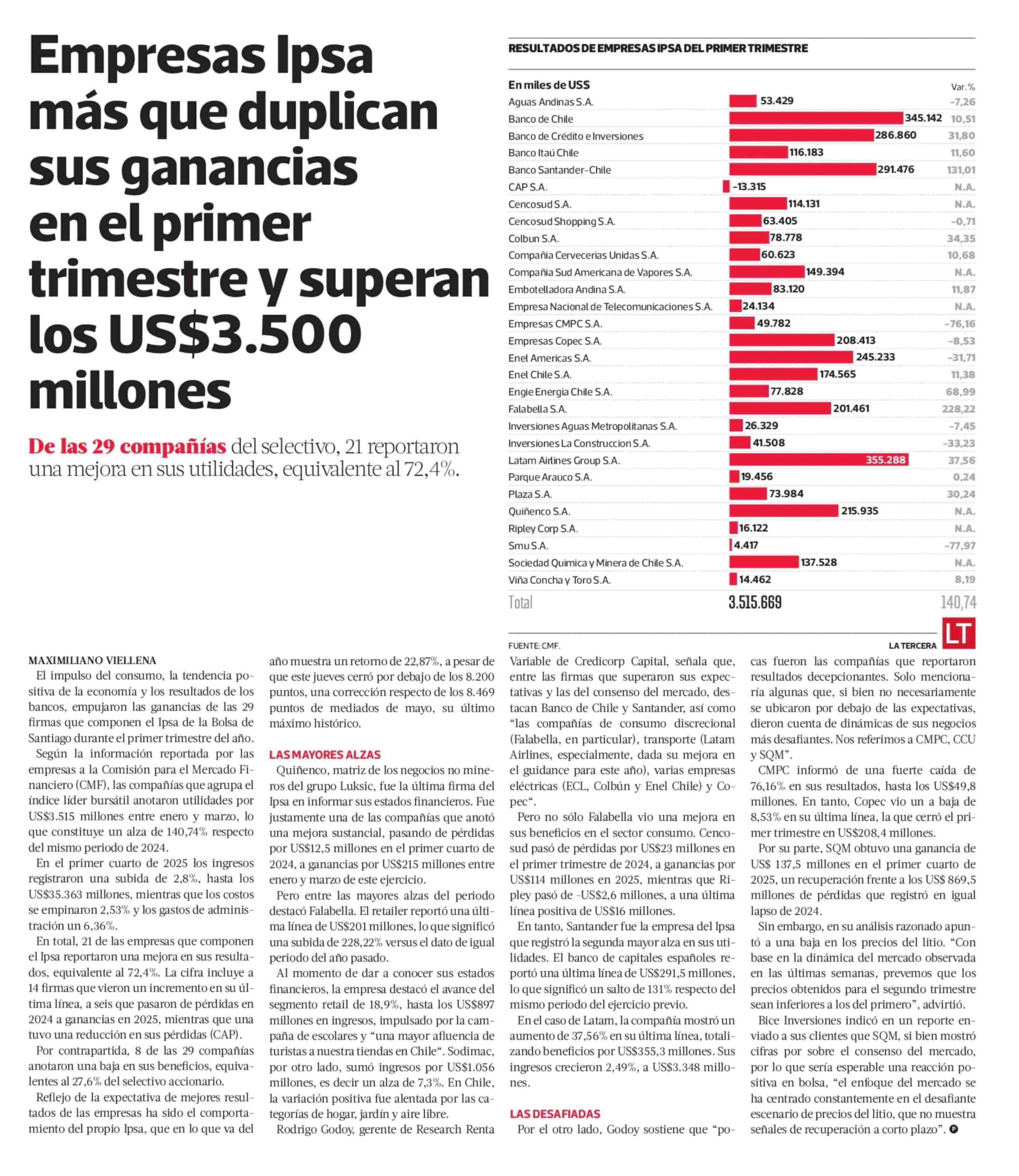 Empresas Ipsa más que duplican sus ganancias en el primer trimestre y superan los US$3.500 millones 30-05-2025 La Tercera |
