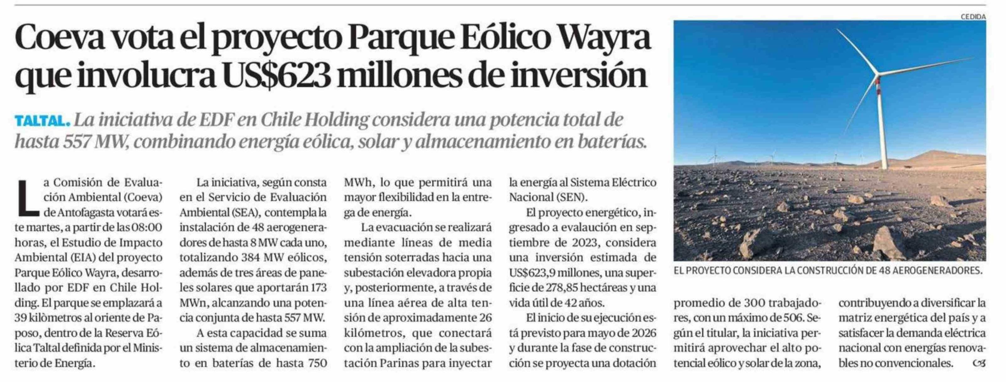 Título: Coeva vota el proyecto Parque Eólico Wayra que involucra US$623 millones de inversión