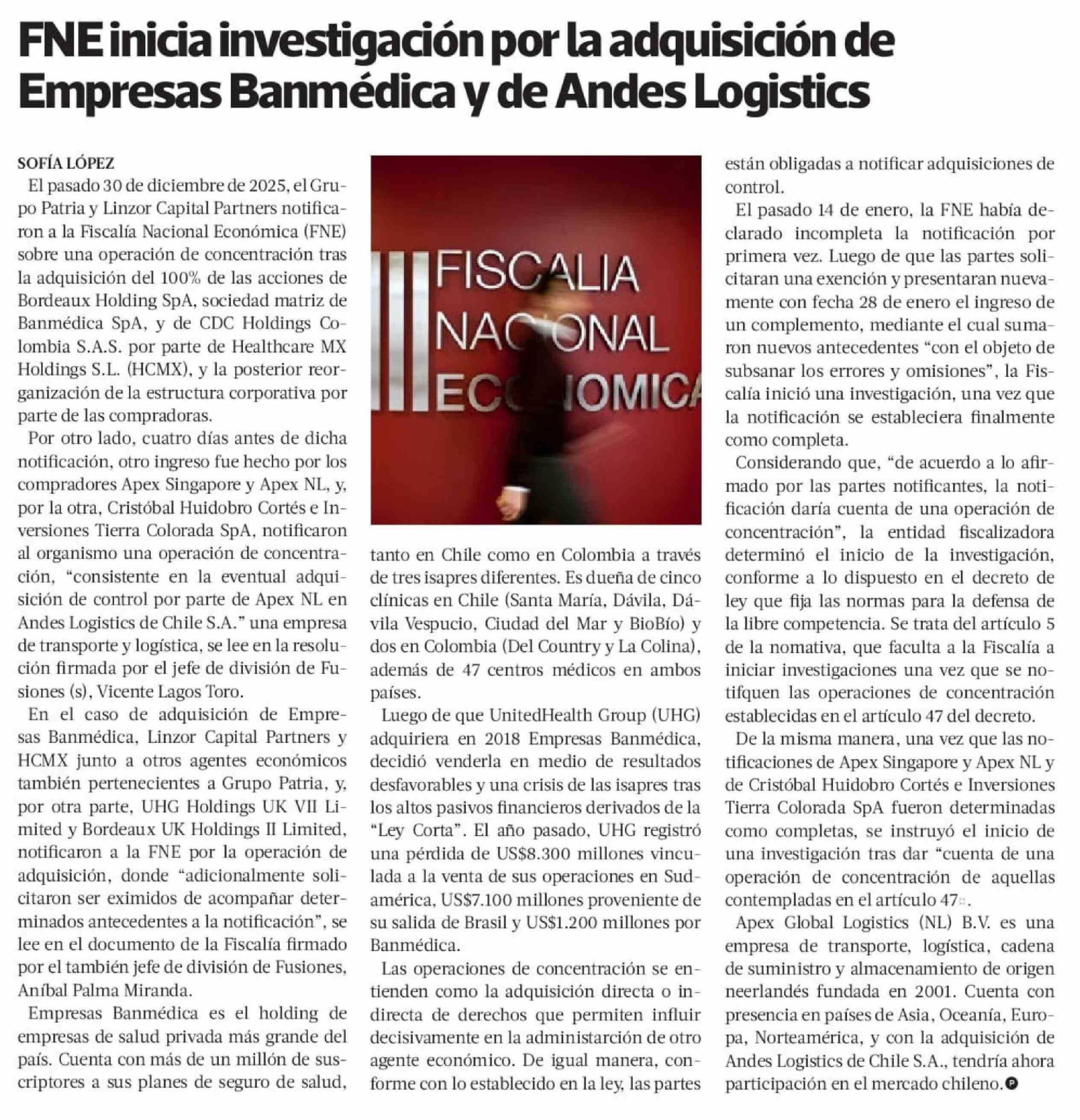 FNE inicia investigación por la adquisición de Empresas Banmédica y de Andes Logistics 12-02-2026 La Tercera |