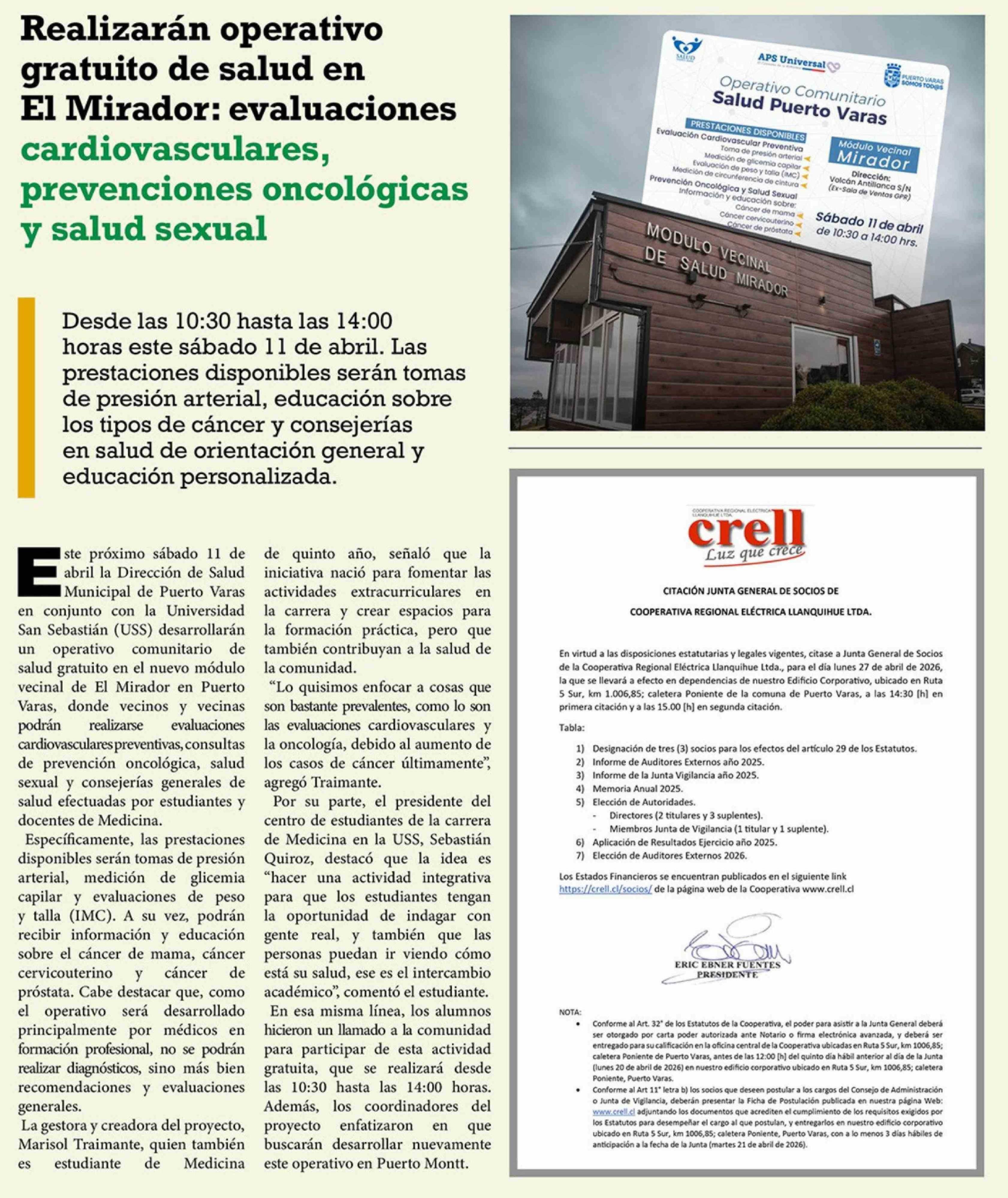 Realizarán operativo gratuito de salud en El Mirador: evaluaciones cardiovasculares, prevenciones oncológicas y salud sexual 07-04-2026 El Heraldo Austral |
