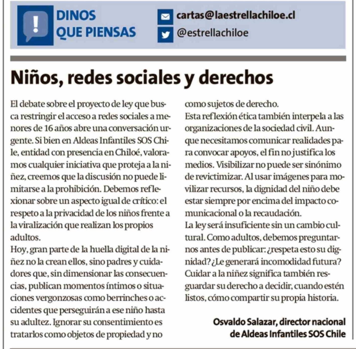 Cartas: Niños, redes sociales y derechos 08-02-2026 La Estrella de Chiloé |