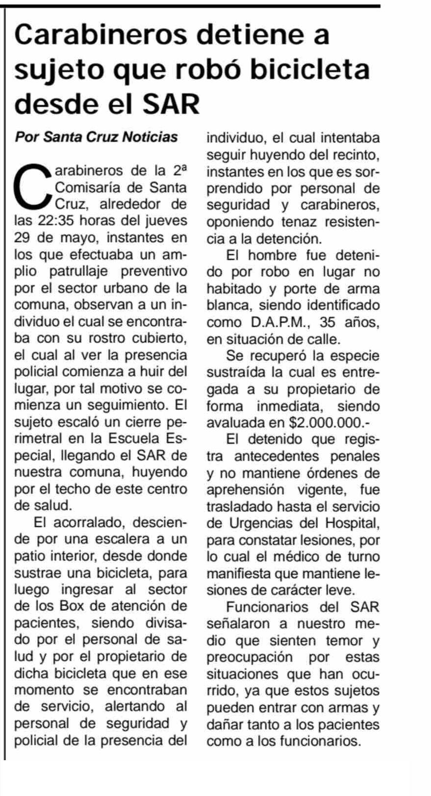 | Título: | Carabineros detiene a que robó bicicleta desde el SAR |