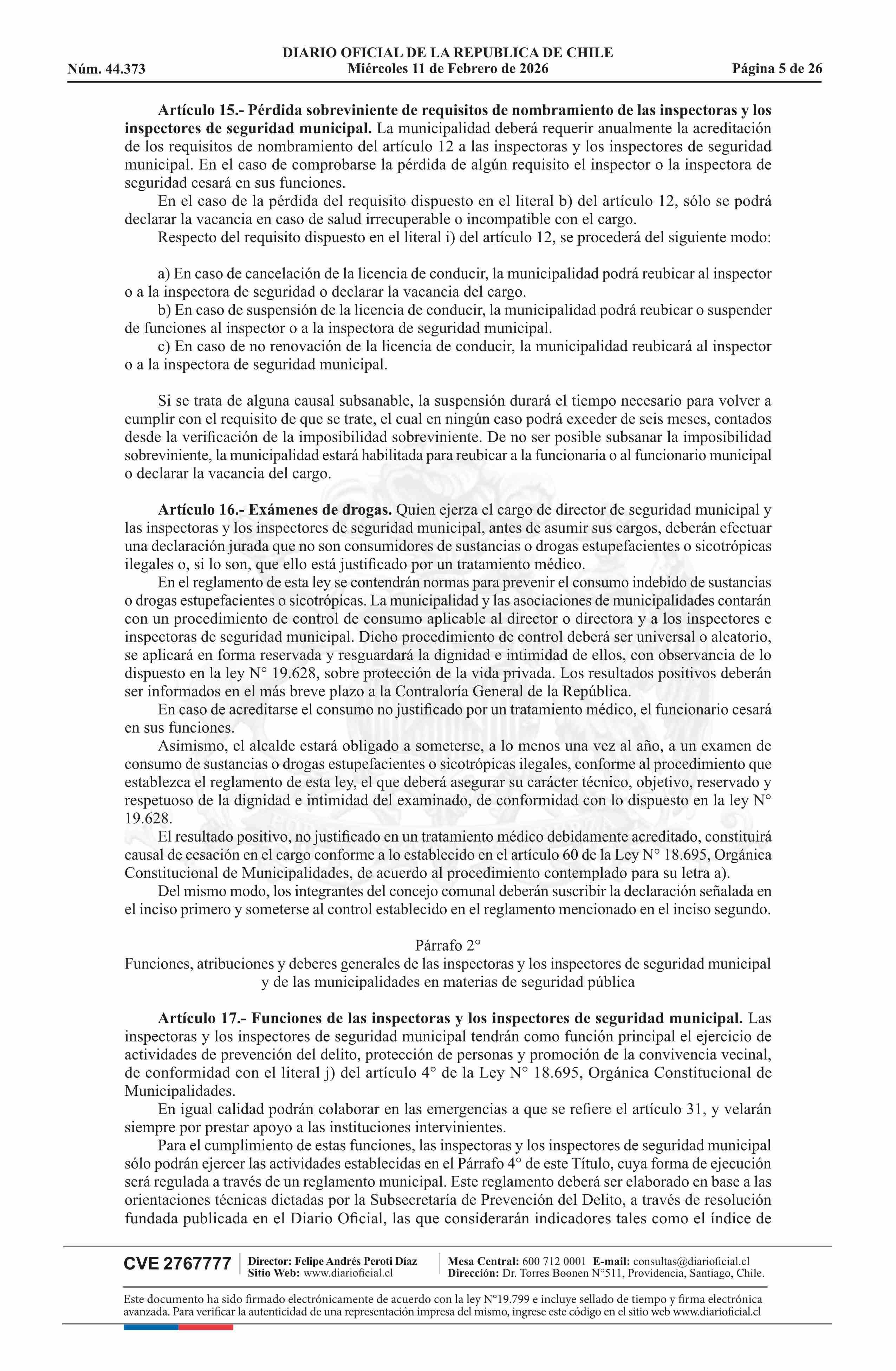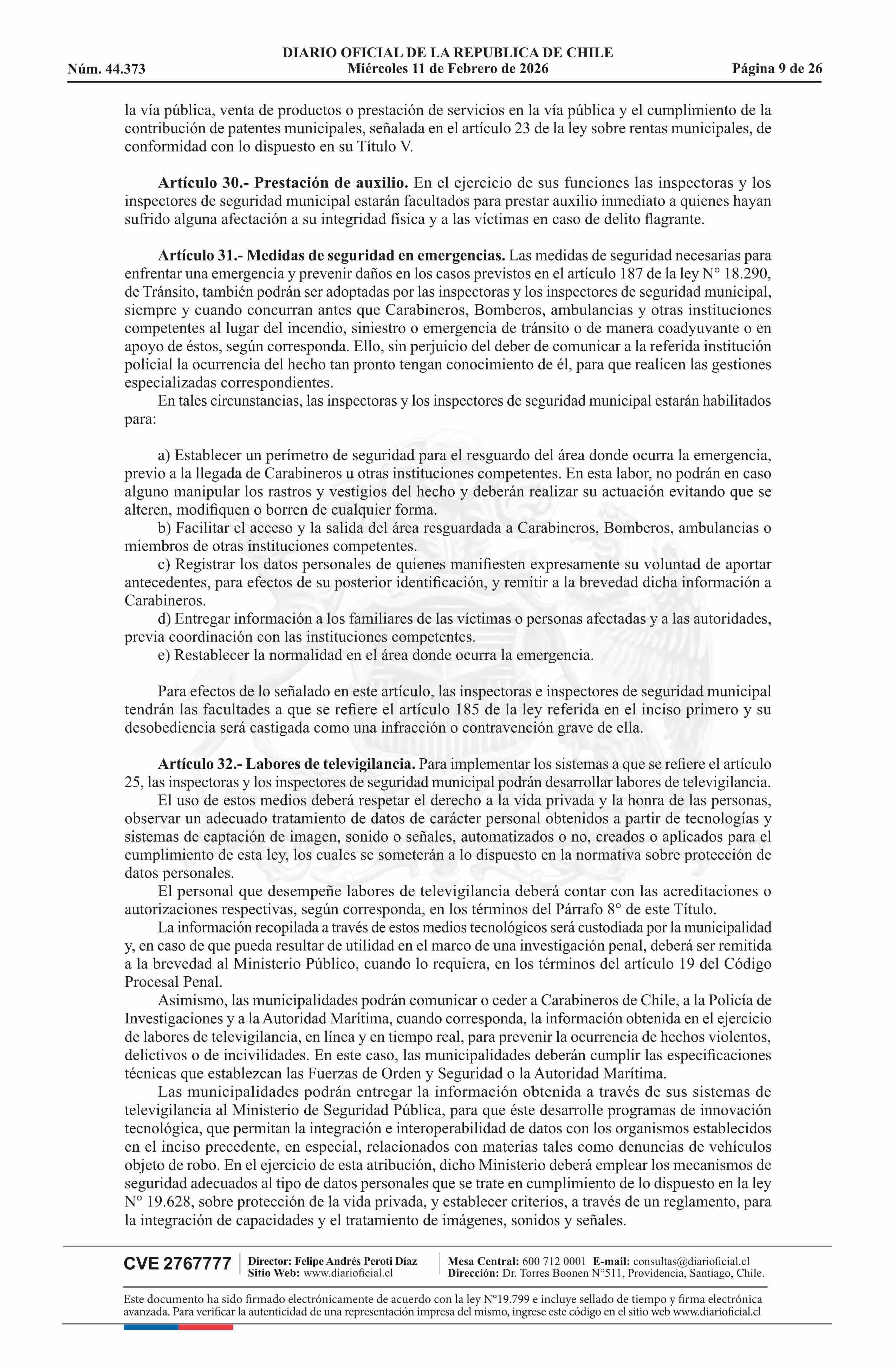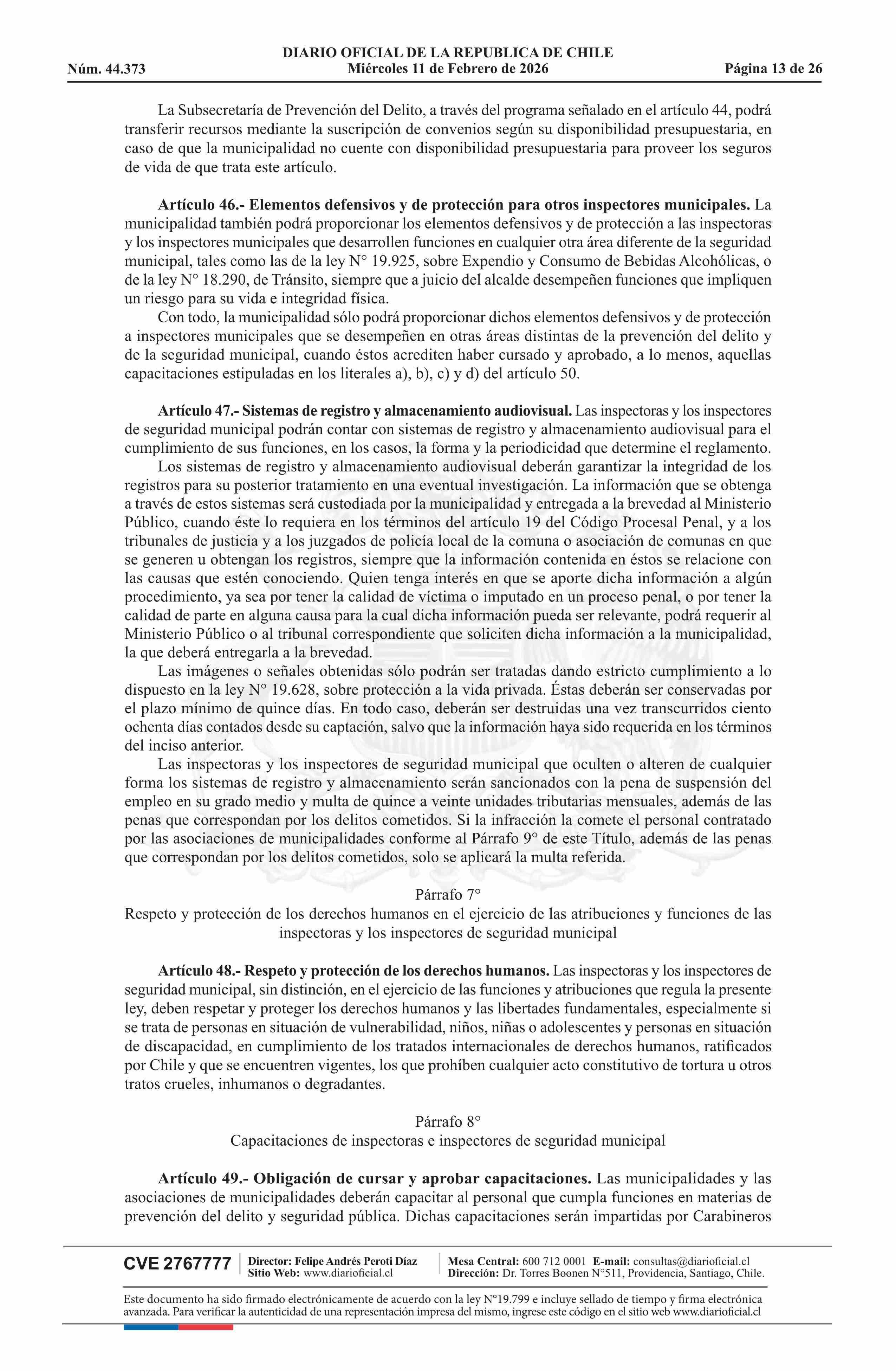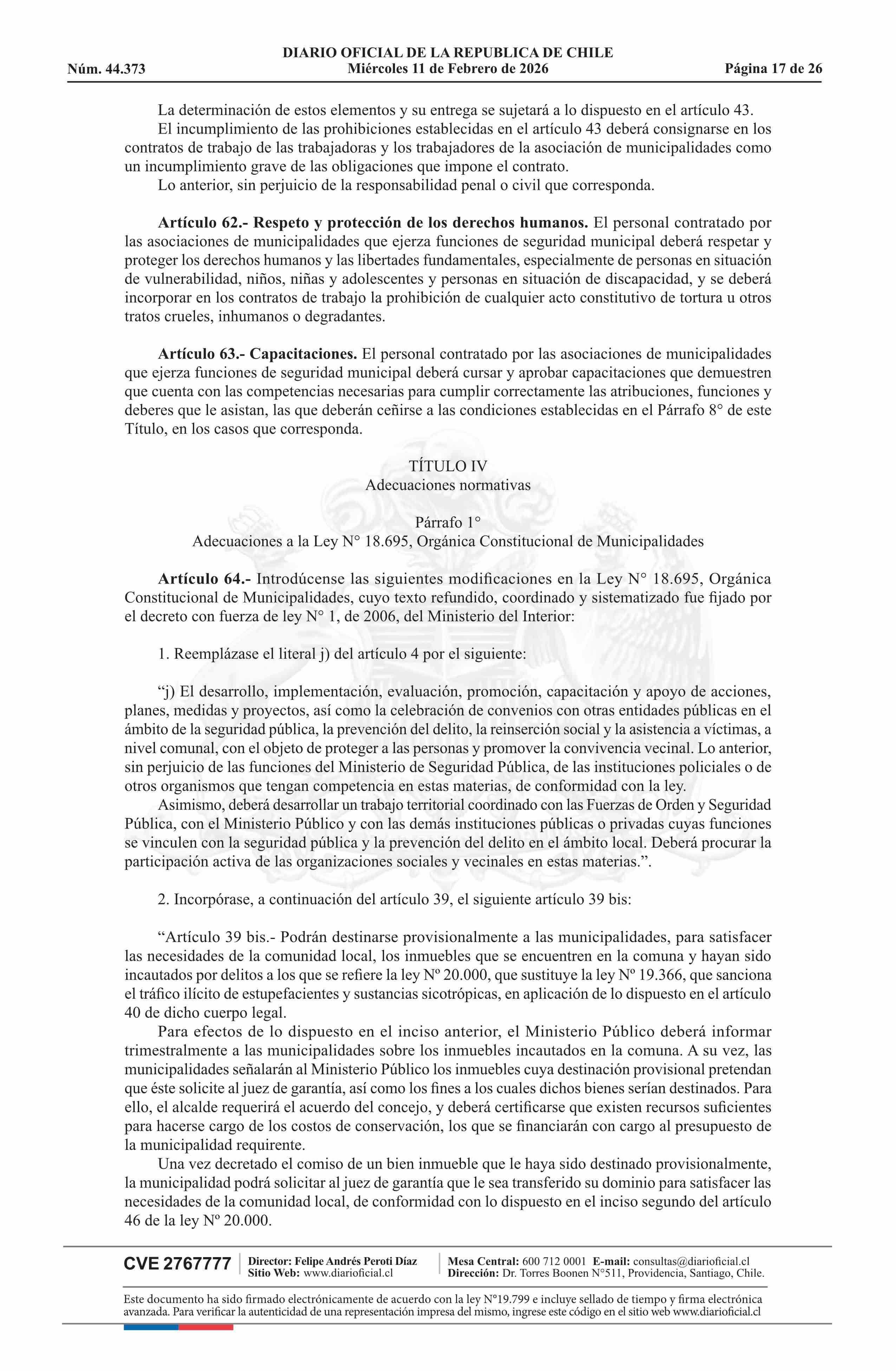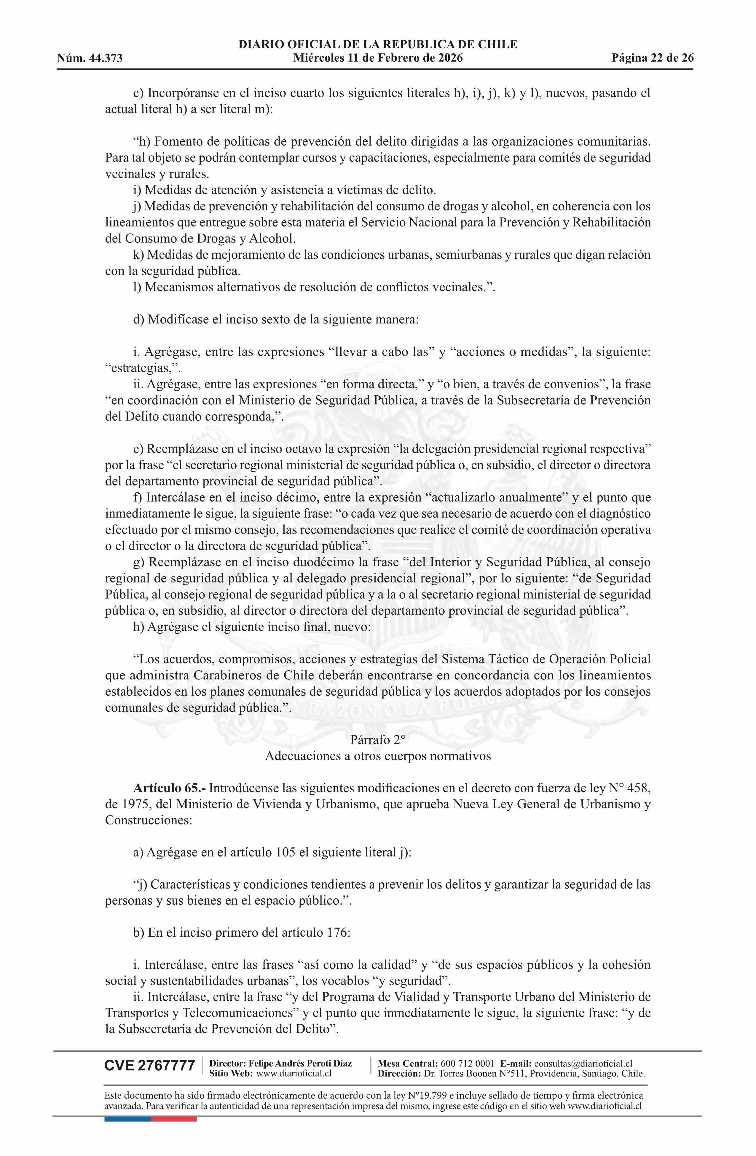| Título: | Ley número 21.802.- Modifica la Ley N° 18.695, Orgánica Constitucional de Municipalidades, y otros cuerpos legales, con el objeto de fortalecer la institucionalidad municipal en materia de seguridad pública y prevención del delito |