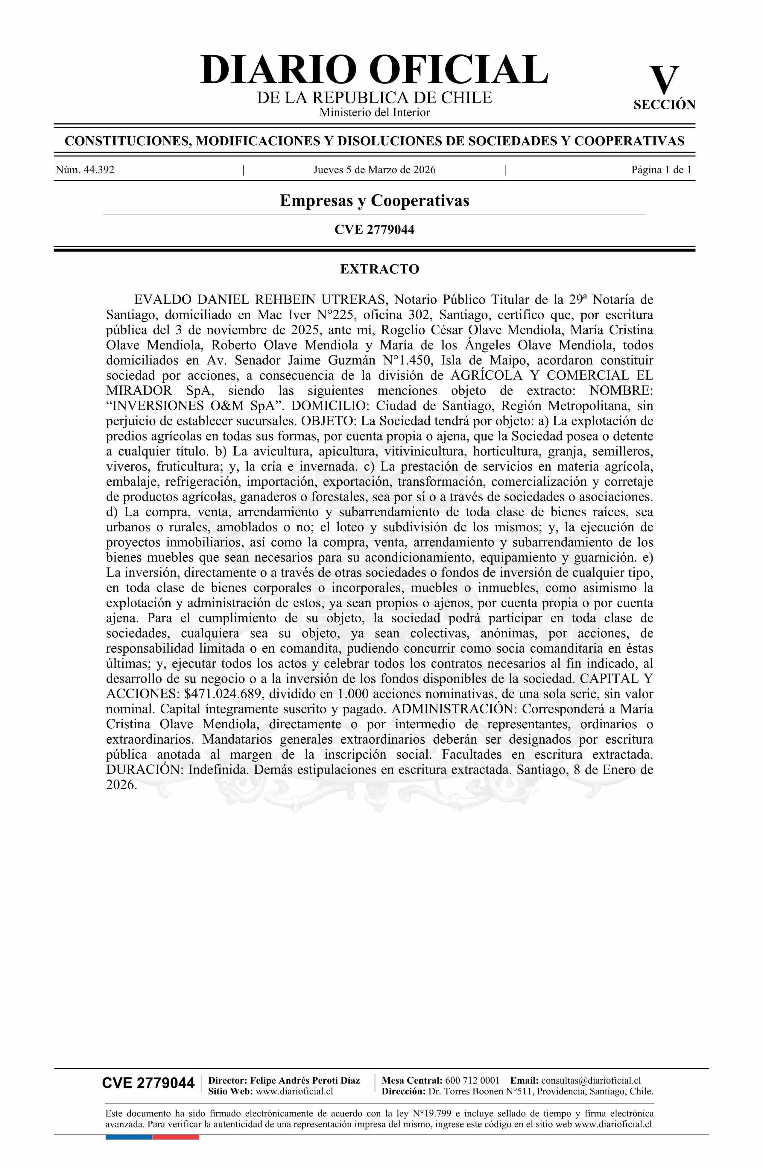 Título: INVERSIONES O&M SpA