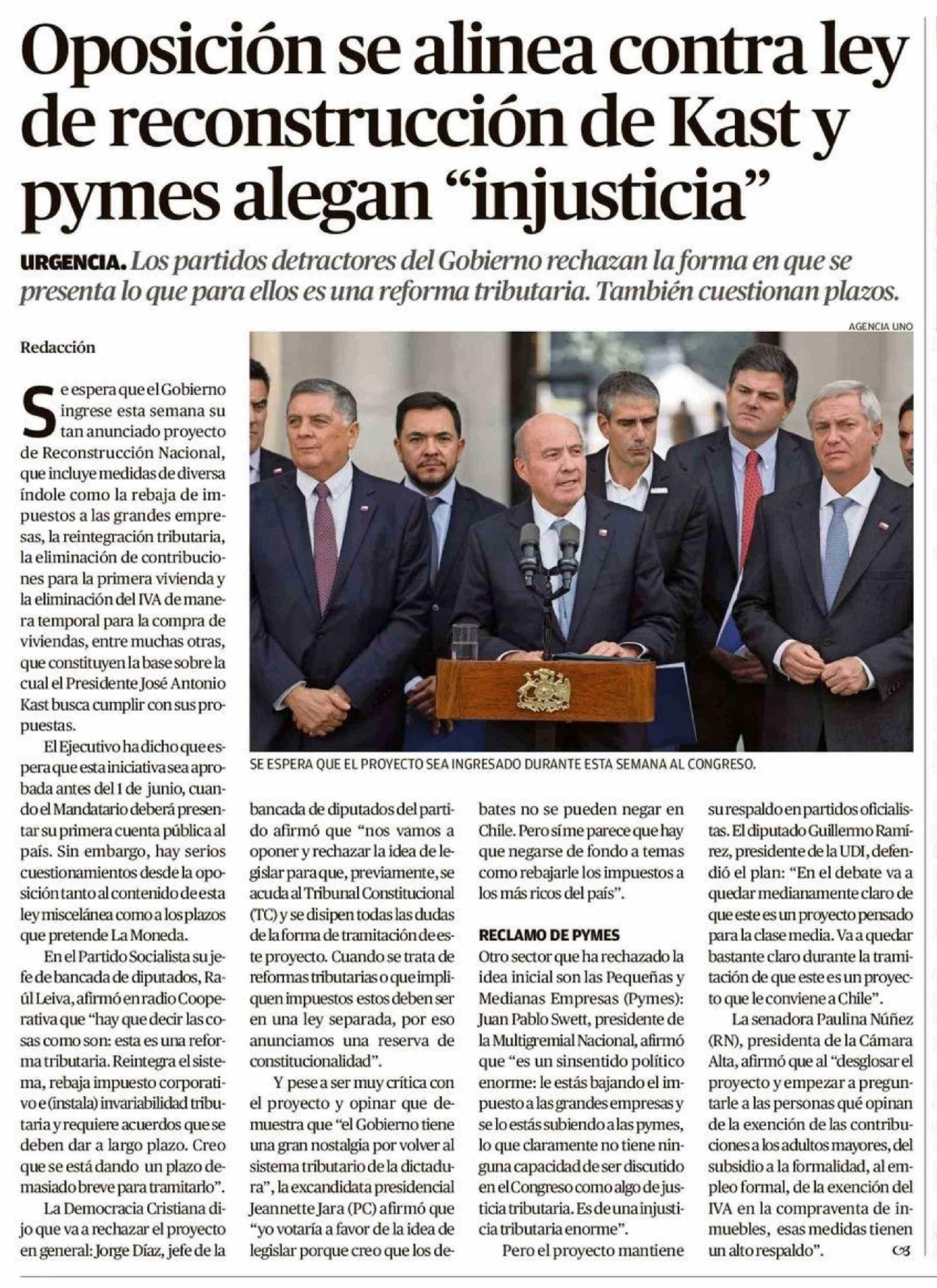 Oposición se alinea contra ley de reconstrucción de Kast y pymes alegan "injusticia" 21-04-2026 El Llanquihue |