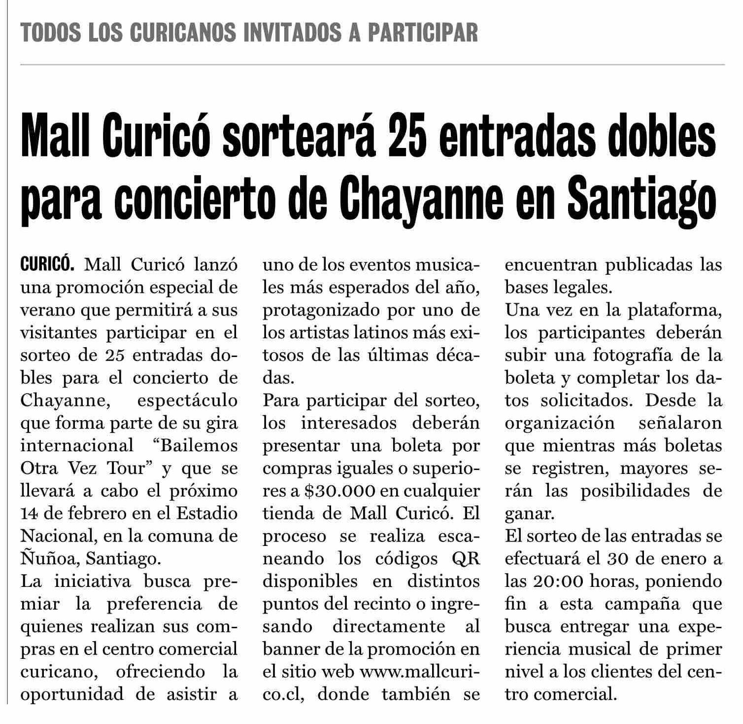 | Título: | Mall Curicó sorteará 25 entradas dobles para concierto de Chayanne en Santiago |
