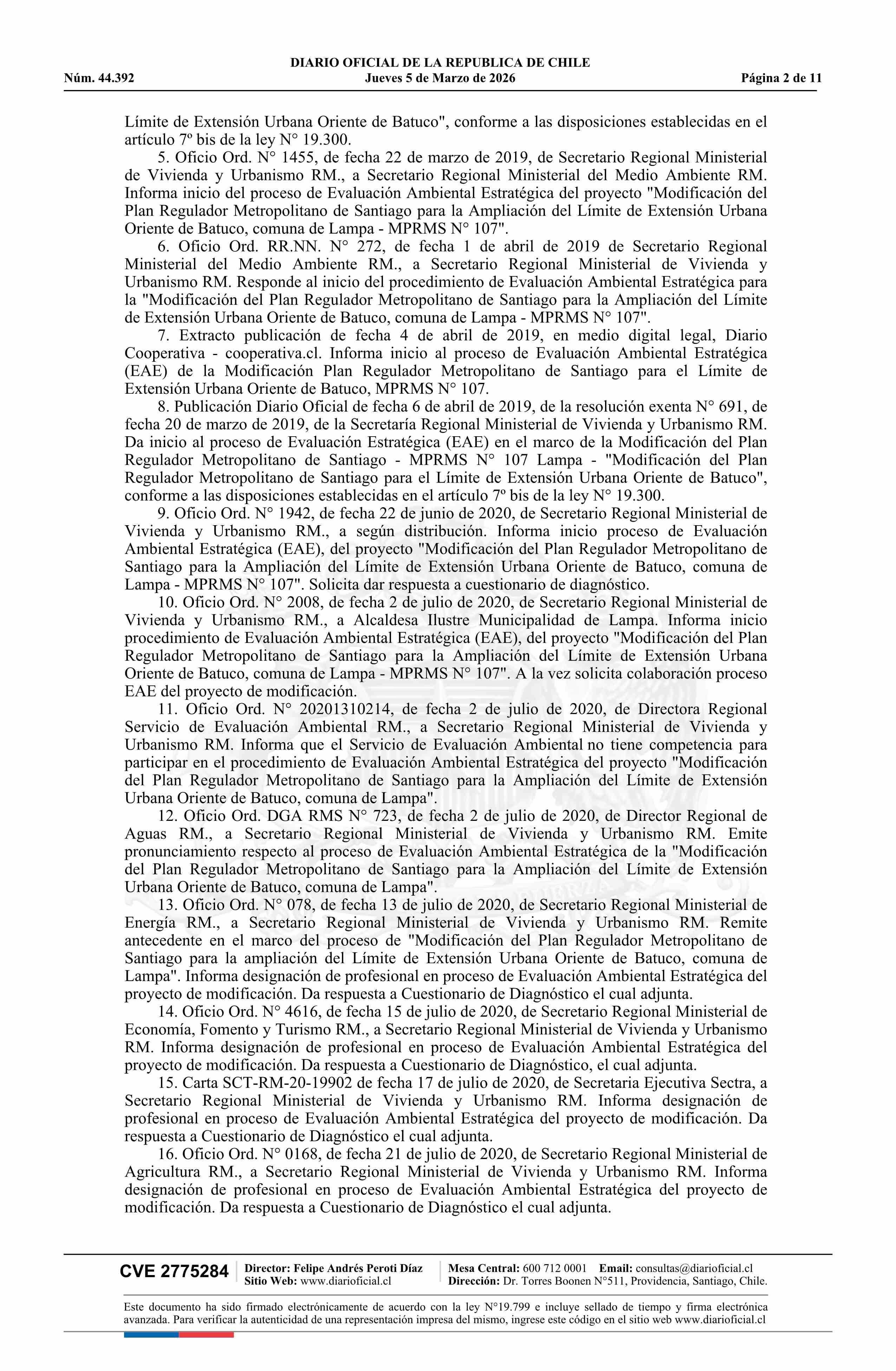 Resolución número 92, de 2025.- Modifica Plan Regulador Metropolitano de Santiago en los términos que indica en el límite de la extensión urbana de Batuco, comuna de Lampa 05-03-2026 Diario Oficial Edición Electrónica |