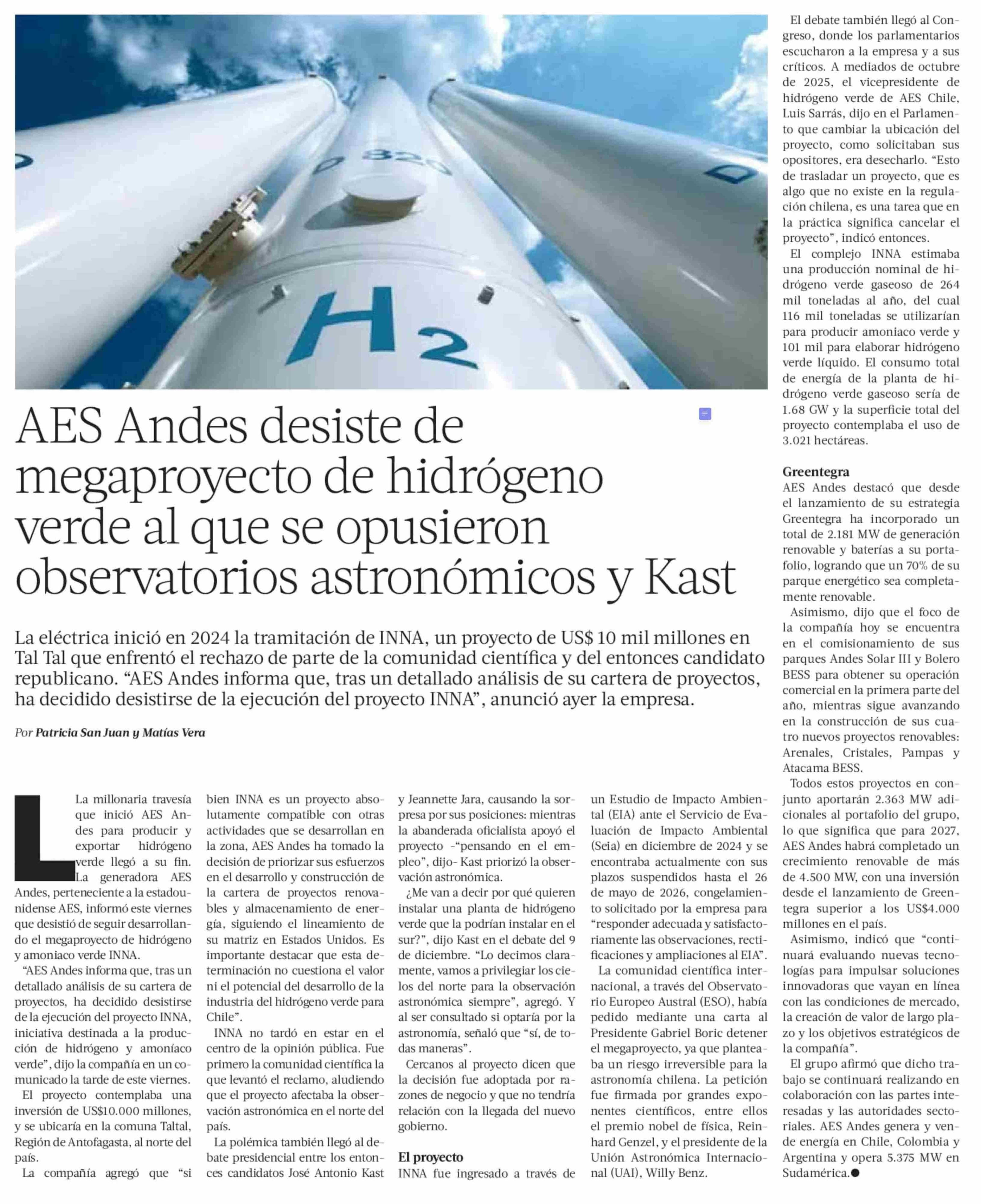 Título: AES Andes desiste de megaproyecto de hidrógeno verde al que se opusieron observatorios astronómicos y Kast