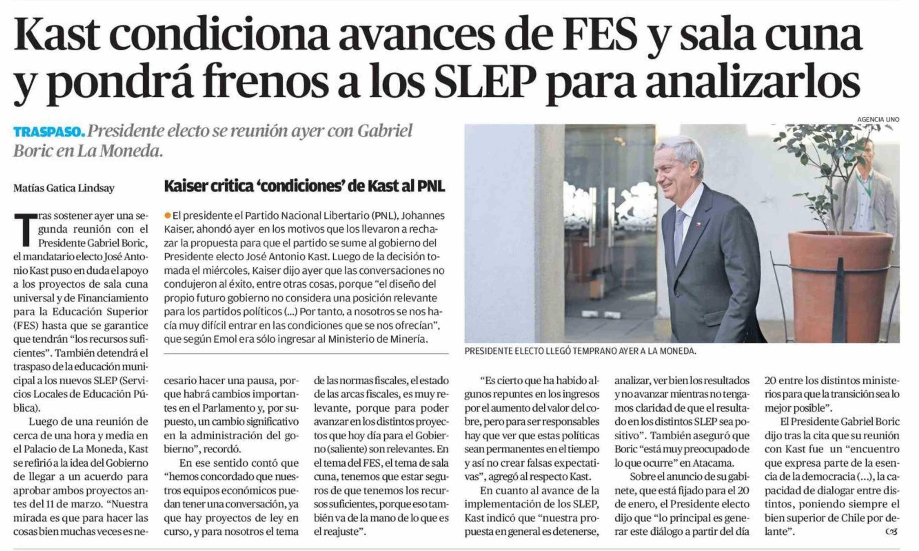 | Título: | Kast condiciona avances de FES y sala cuna y pondrá frenos a los SLEP para analizarlos |