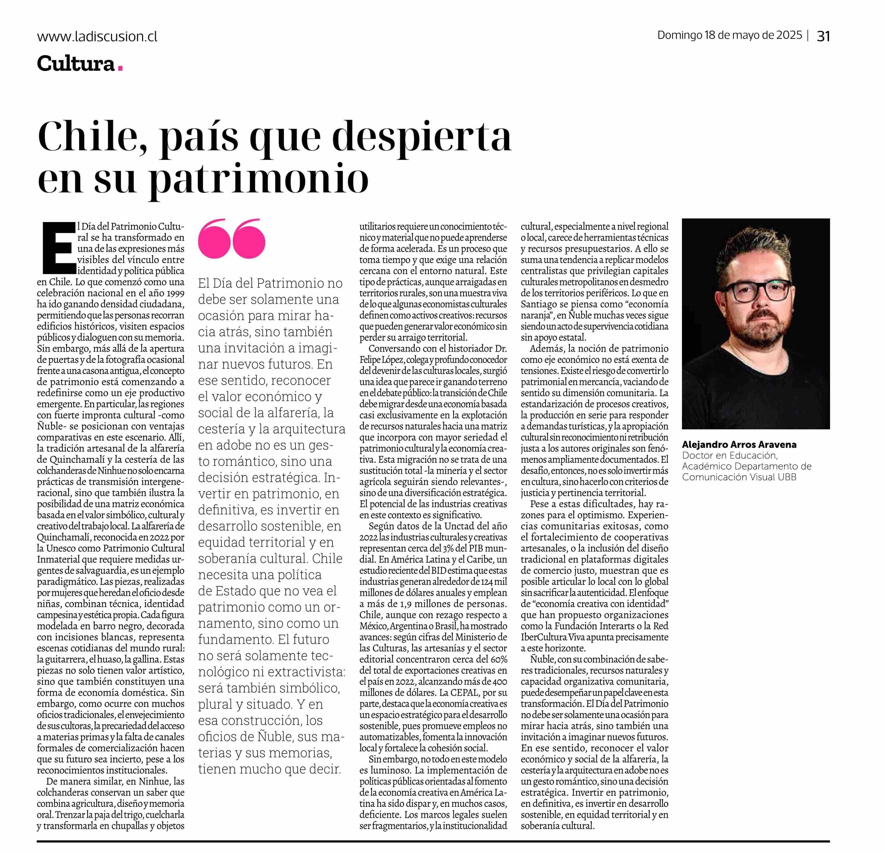 COLUMNAS DE OPINIÓN: Chile, país que despierta en su patrimonio 25-05-2025 La Discusión |