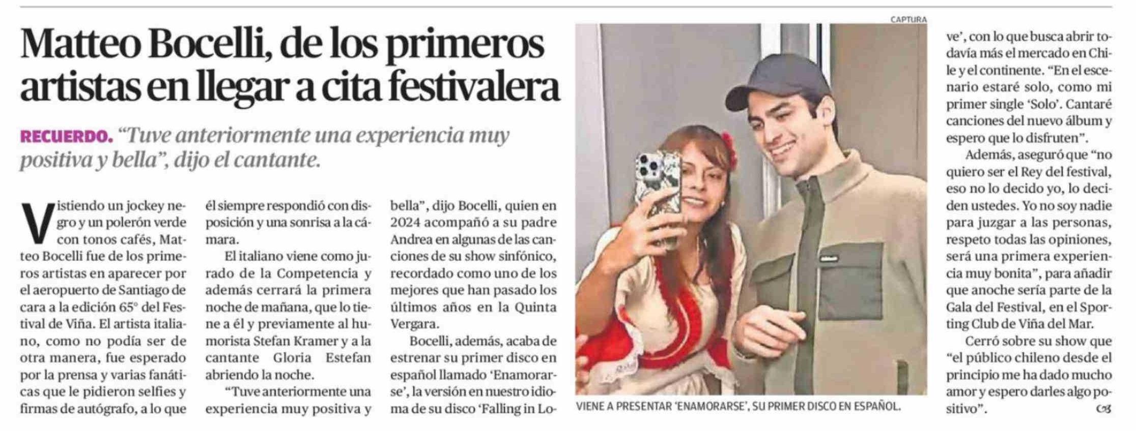 Título: Matteo Bocelli, de los primeros artistas en llegar a cita festivalera
