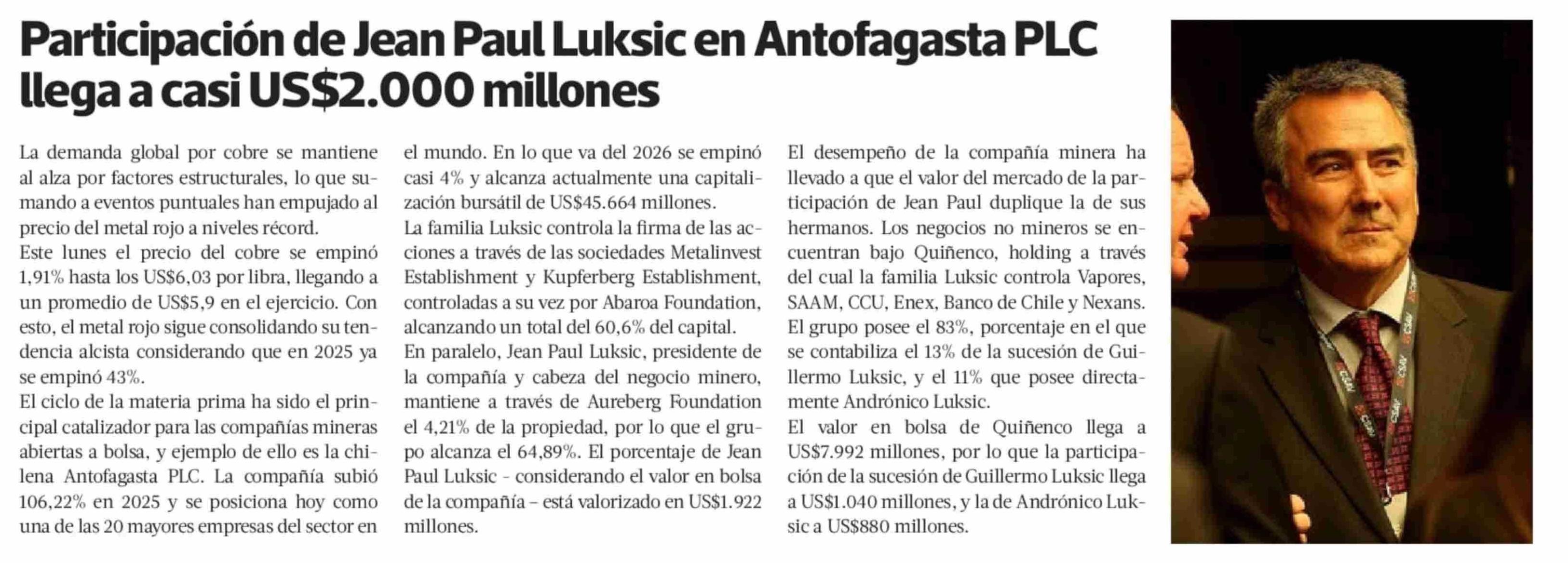 Título: Participación de Jean Paul Luksic en Antofagasta PLC llega a casi US$2.000 millones