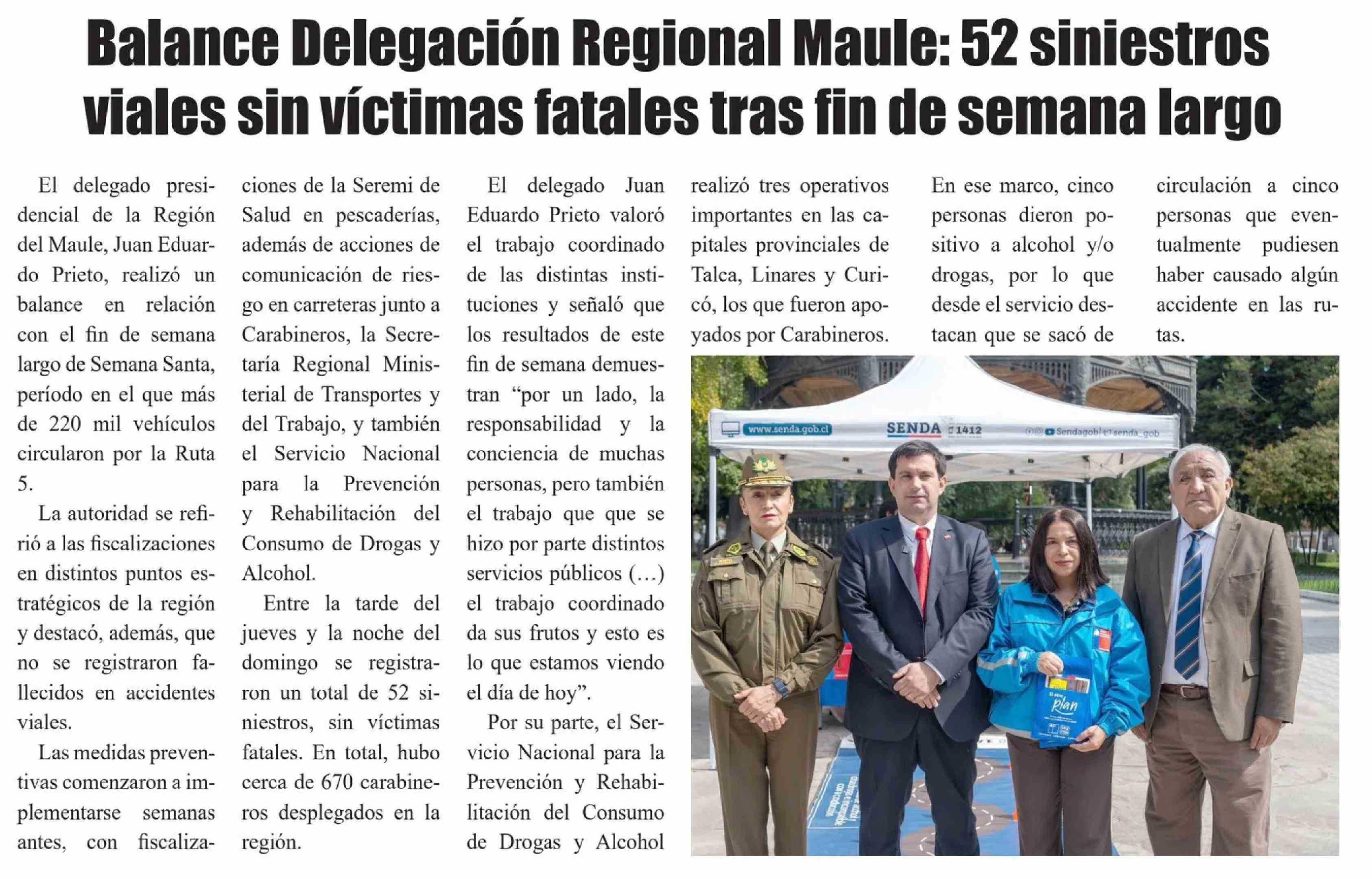 Balance Delegación Regional Maule: 52 siniestros viales sin víctimas fatales tras fin de semana largo 08-04-2026 El Heraldo |