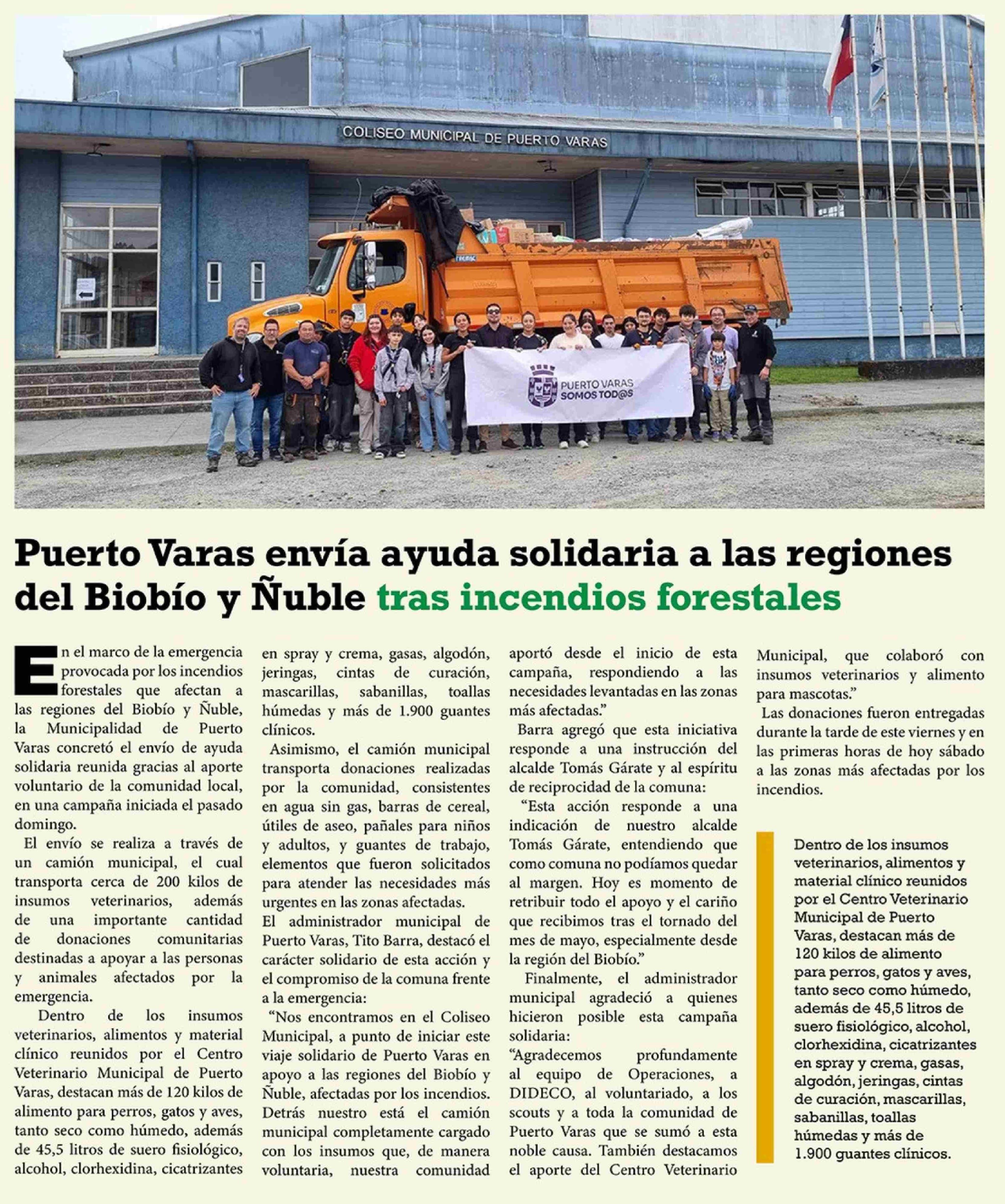 Puerto Varas envía ayuda solidaria a las regiones del Biobio y Nuble tras incendios forestales 24-01-2026 El Heraldo Austral |