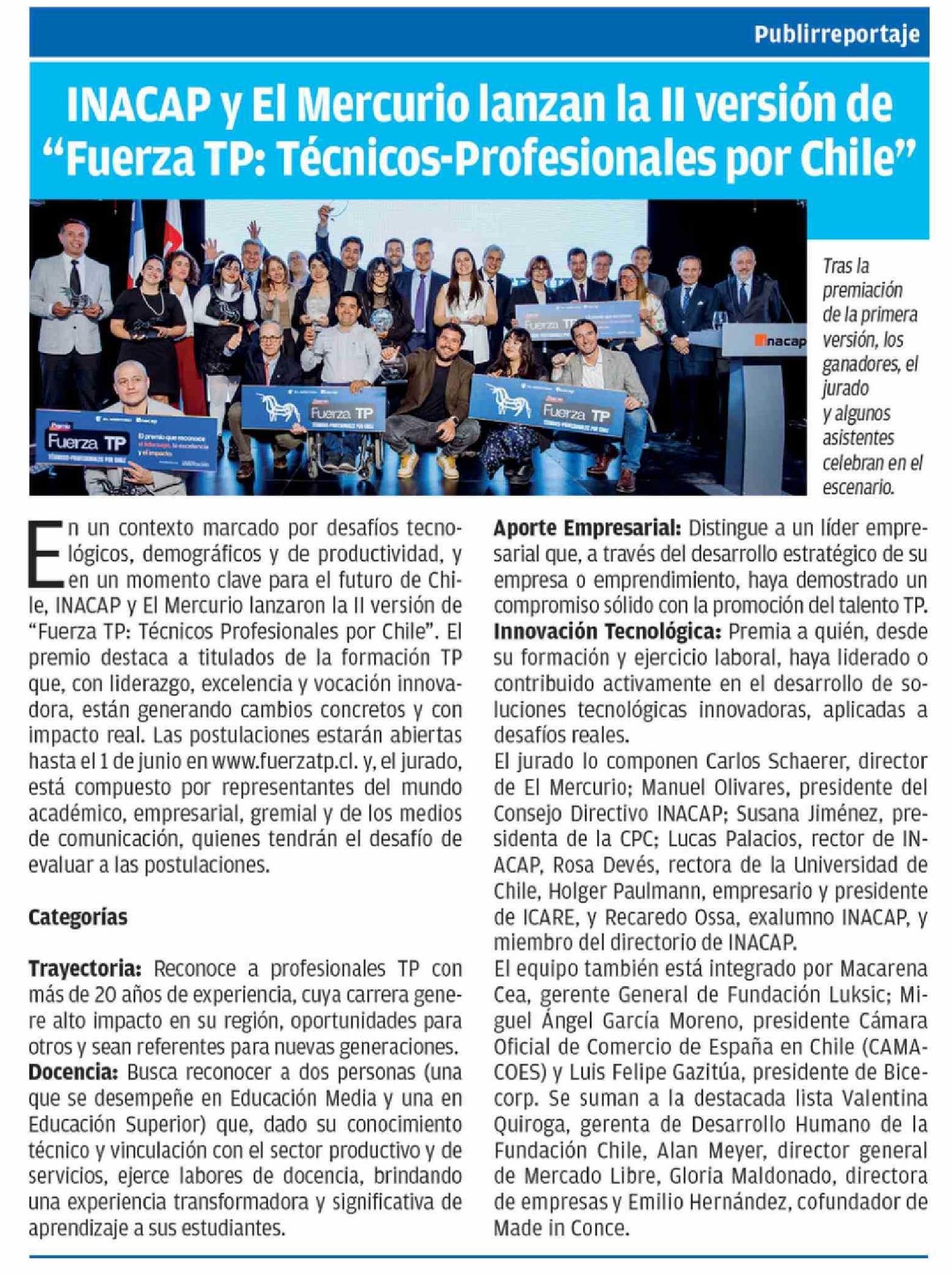 | Título: | INACAP y El Mercurio lanzan la II versión de "Fuerza TP: Técnicos-Profesionales por Chile" |