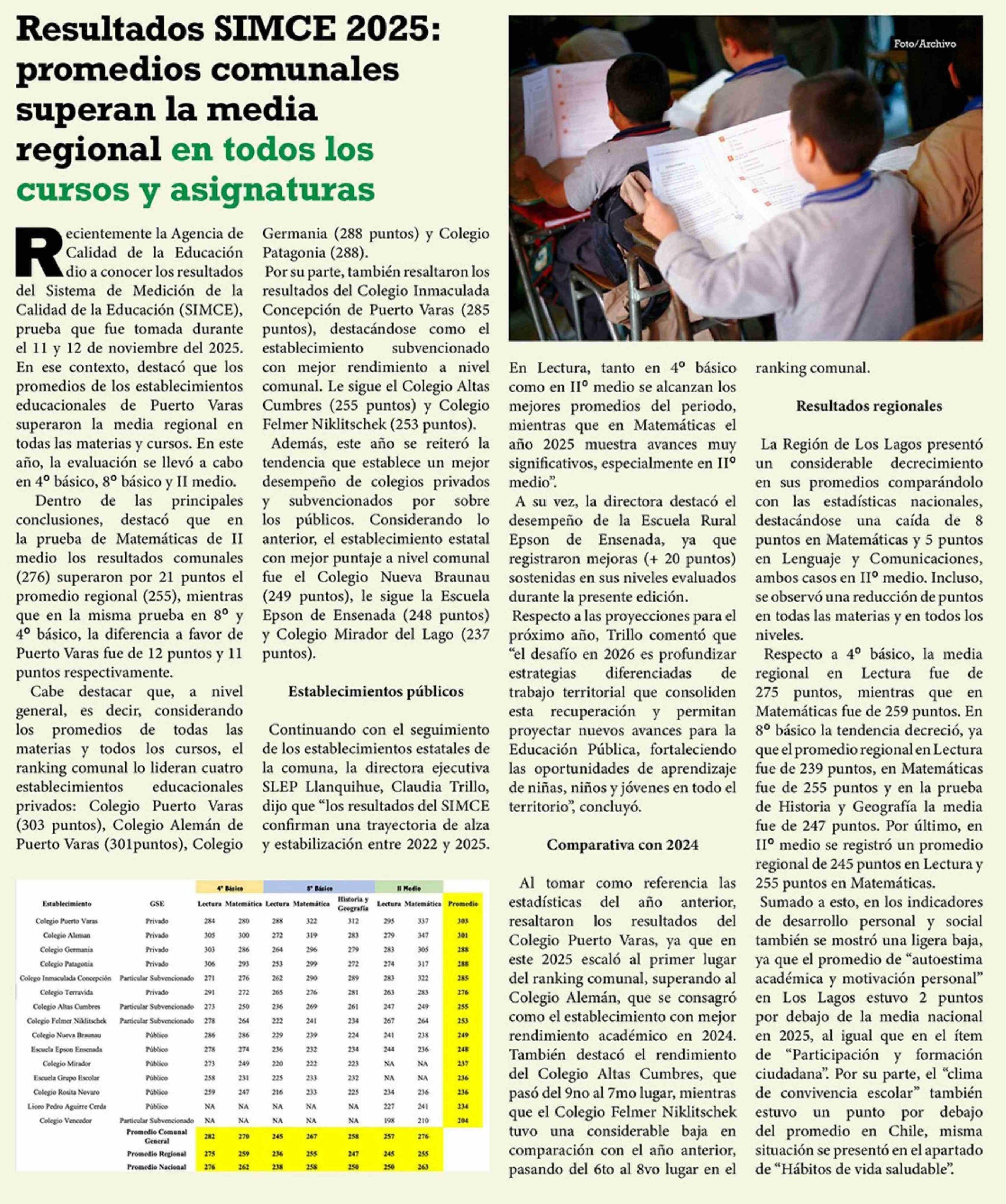 Título: Resultados SIMCE 2025: promedios comunales superan la media regional en todos los cursos y asignaturas