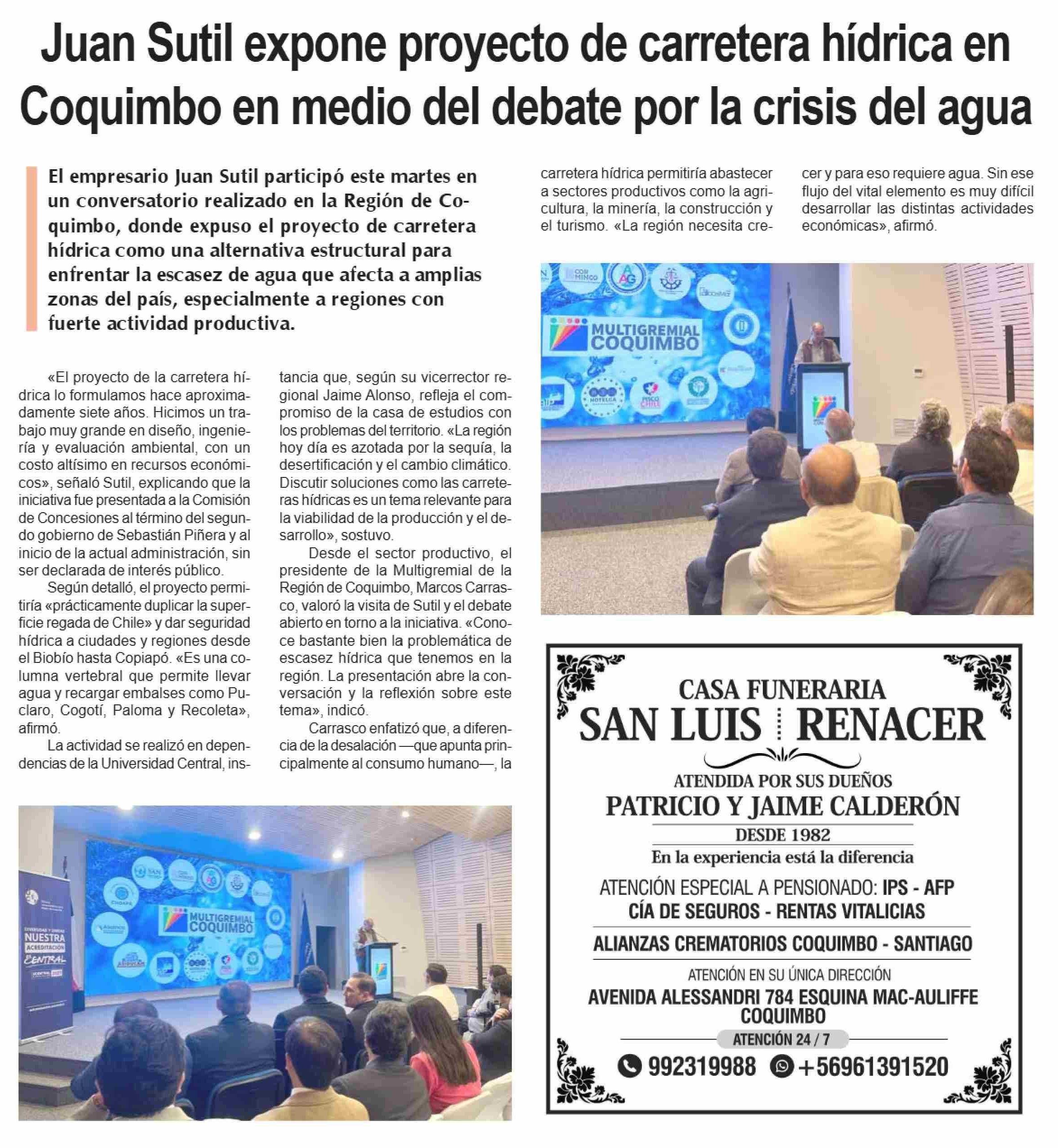 Juan Sutil expone proyecto de carretera hídrica en Coquimbo en medio del debate por la crisis del agua 07-01-2026 Diario la Región |