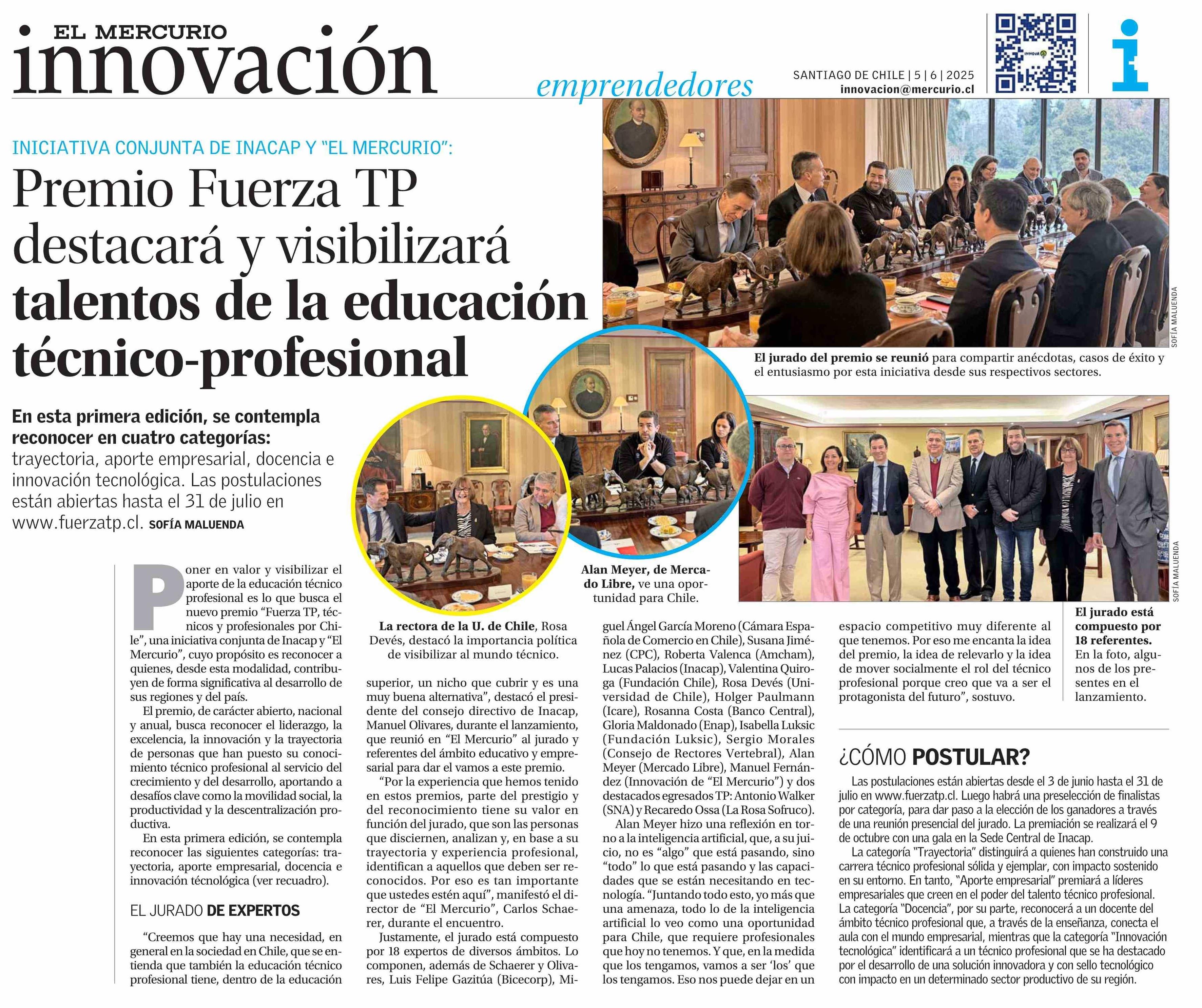 Premio Fuerza TP destacará y visibilizará talentos de la educación técnico-profesional 05-06-2025 El Mercurio |