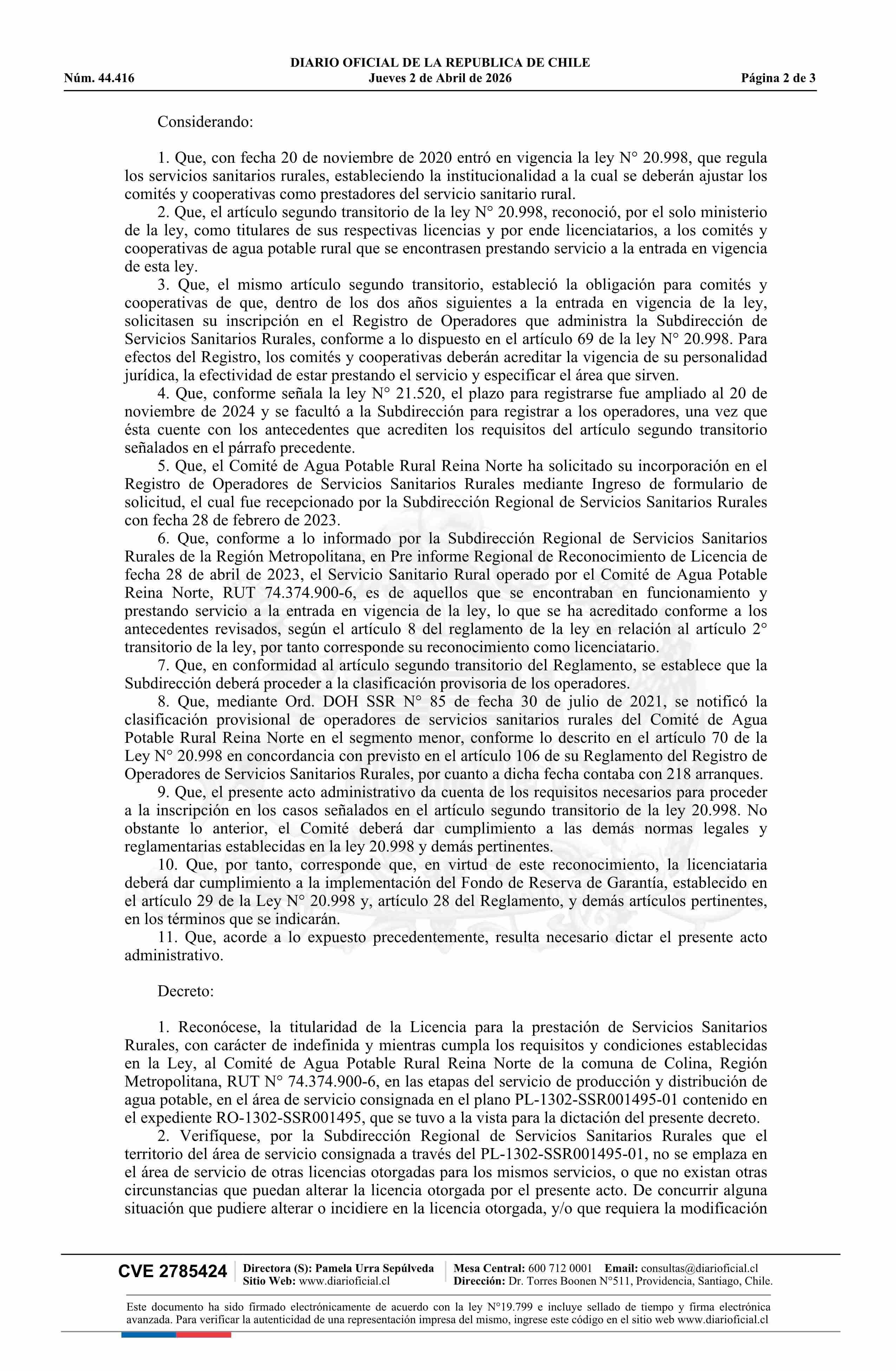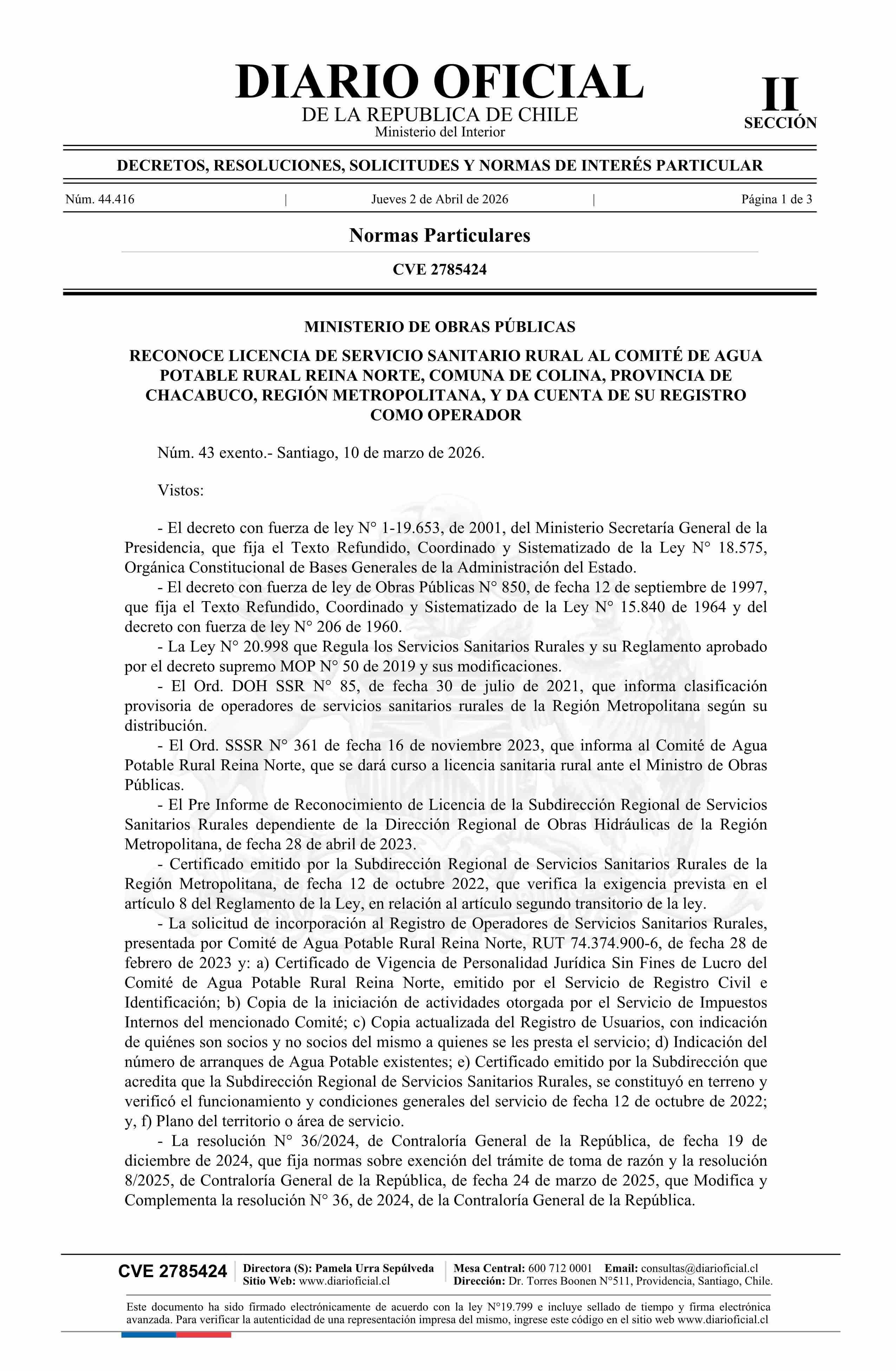 | Título: | Decreto exento número 43, de 2026.- Reconoce Licencia de servicio sanitario rural al Comité de Agua Potable Rural Reina Norte, comuna de Colina, provincia de Chacabuco, Región Metropolitana, y da cuenta de su registro como operador |