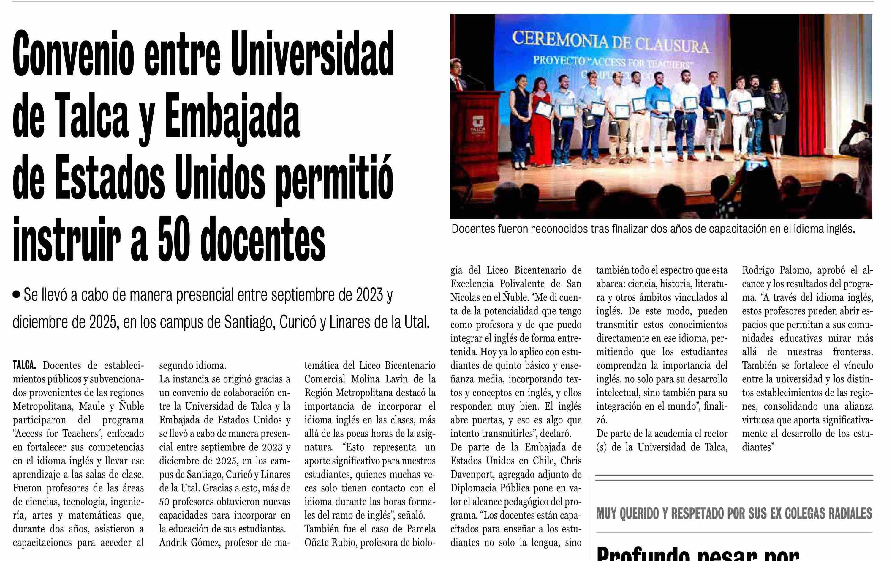 Título: Convenio entre Universidad de Talca y Embajada de Estados Unidos permitió instruir a 50 docentes