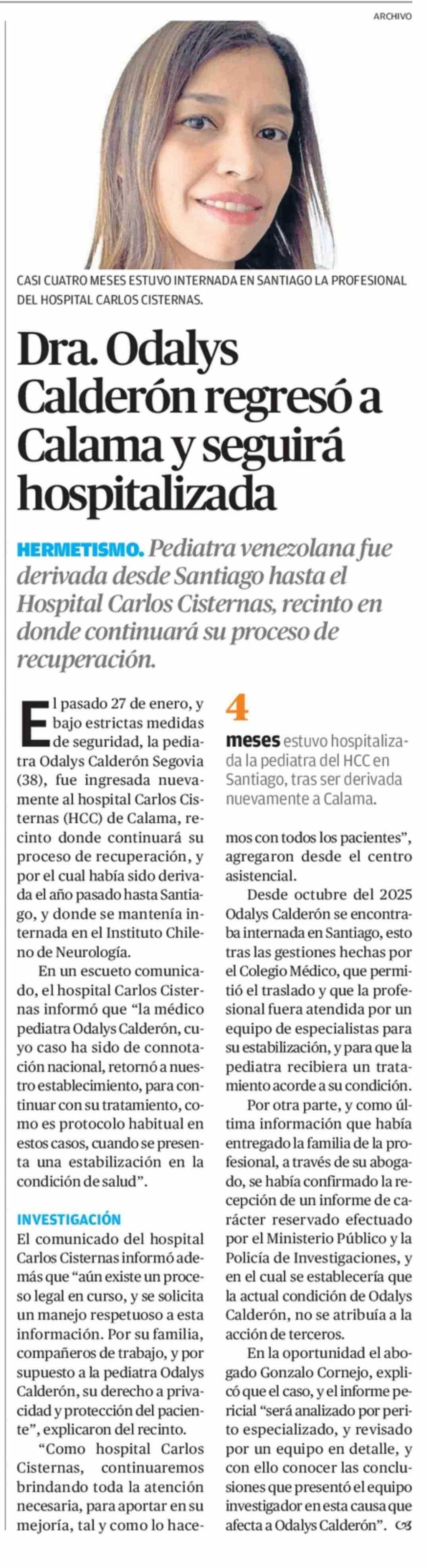 Dra. Odalys Calderón regresó a Calama y seguirá hospitalizada 06-02-2026 El Mercurio de Antofagasta |
