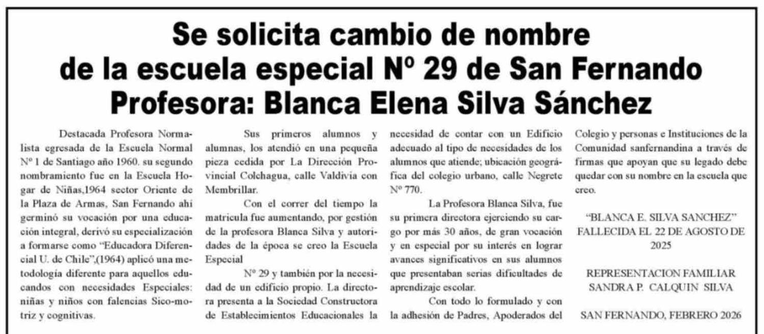 Se solicita cambio de nombre de la escuela especial Nº 29 de San Fernando Profesora: Blanca Elena Silva Sánchez 27-02-2026 Diario VI Región |