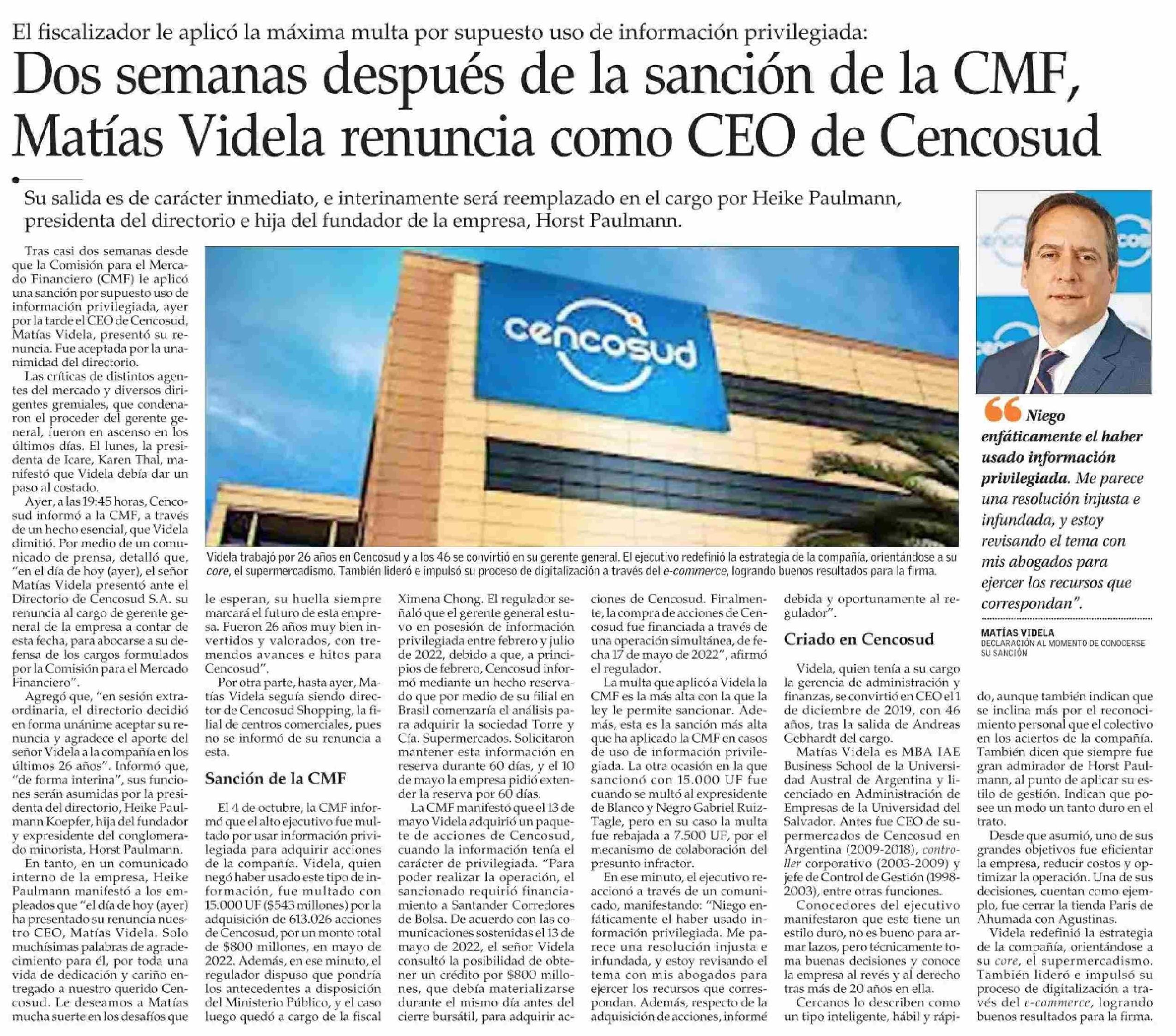 Dos semanas después de la sanción de la CME, Matías Videla renuncia como CEO de Cencosud 18-10-2023 El Mercurio Segunda Edición (B) - Chile |