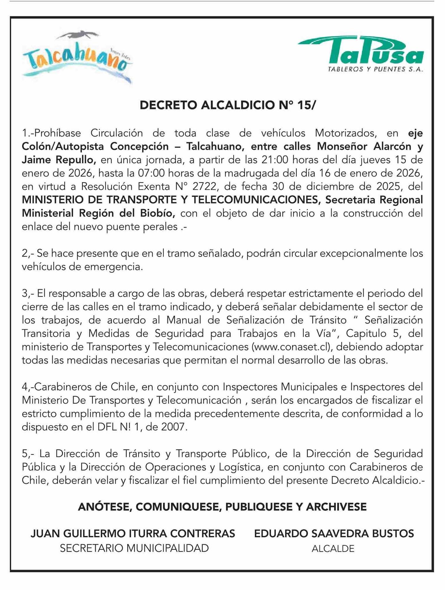 Extractos: DECRETO ALCALDICIO Nº 15/