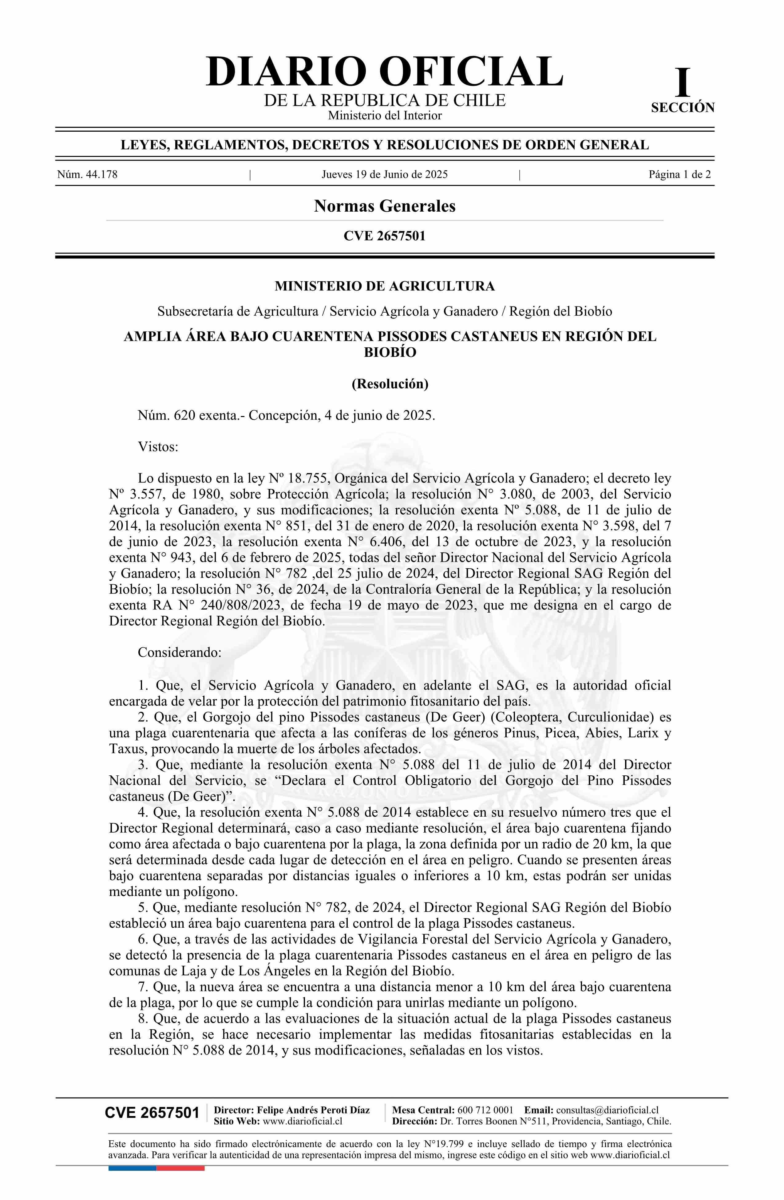 | Título: | Resolución exenta número 620, de 2025.- Amplía área bajo cuarentena Pissodes castaneus en Región del Biobío |