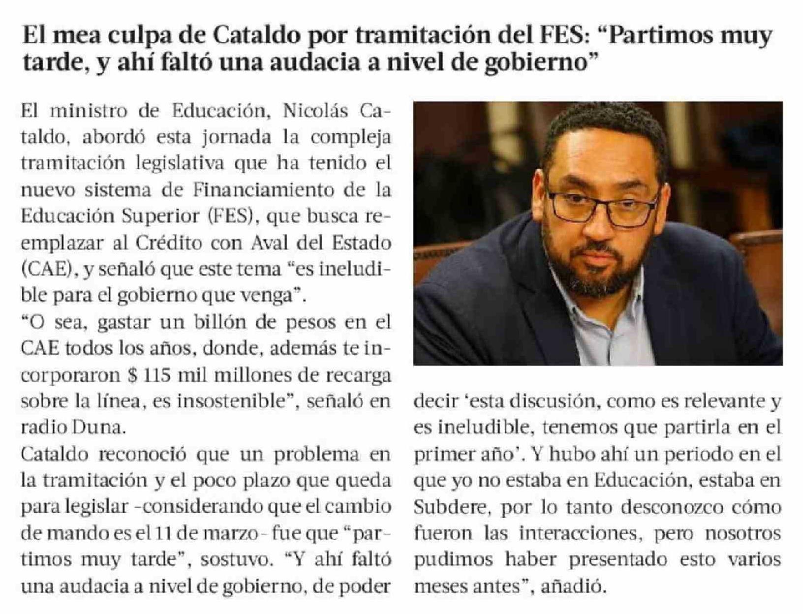 Título: El mea culpa de Cataldo por tramitación del FES: "Partimos muy tarde, y ahí faltó una audacia a nivel de gobierno"