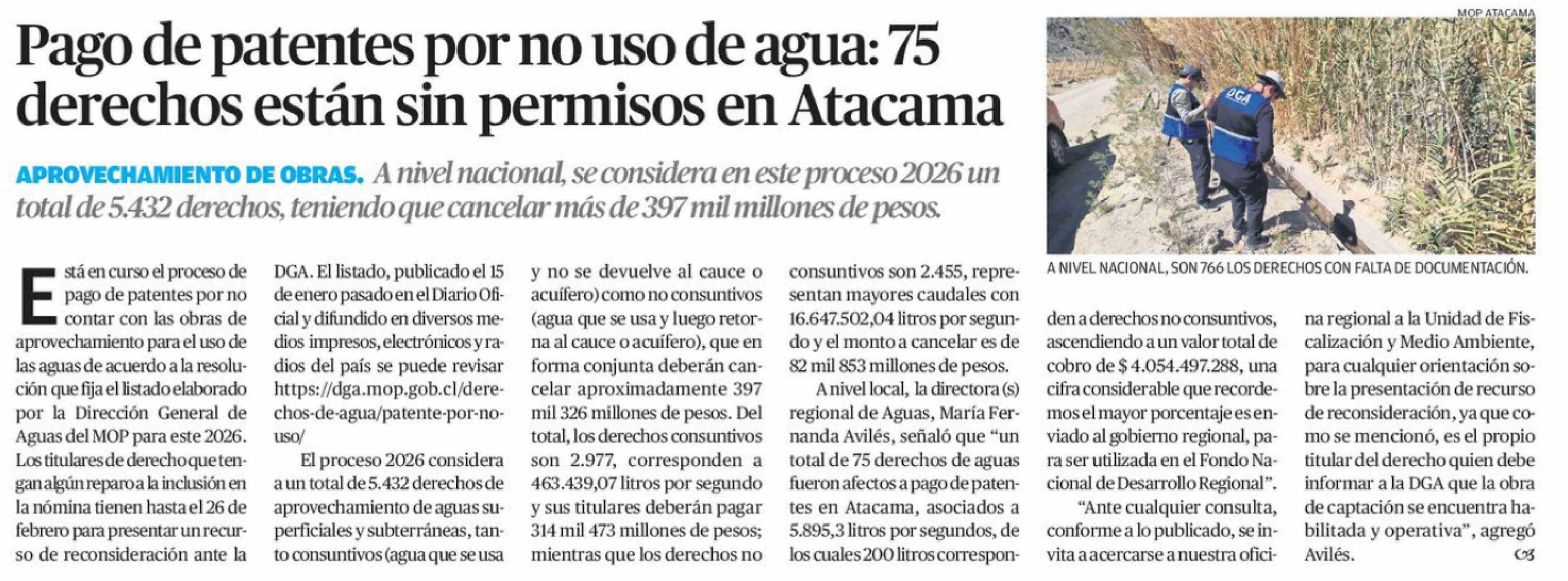 Pago de patentes por no uso de agua: 75 derechos están sin permisos en Atacama 11-02-2026 El Diario de Atacama |