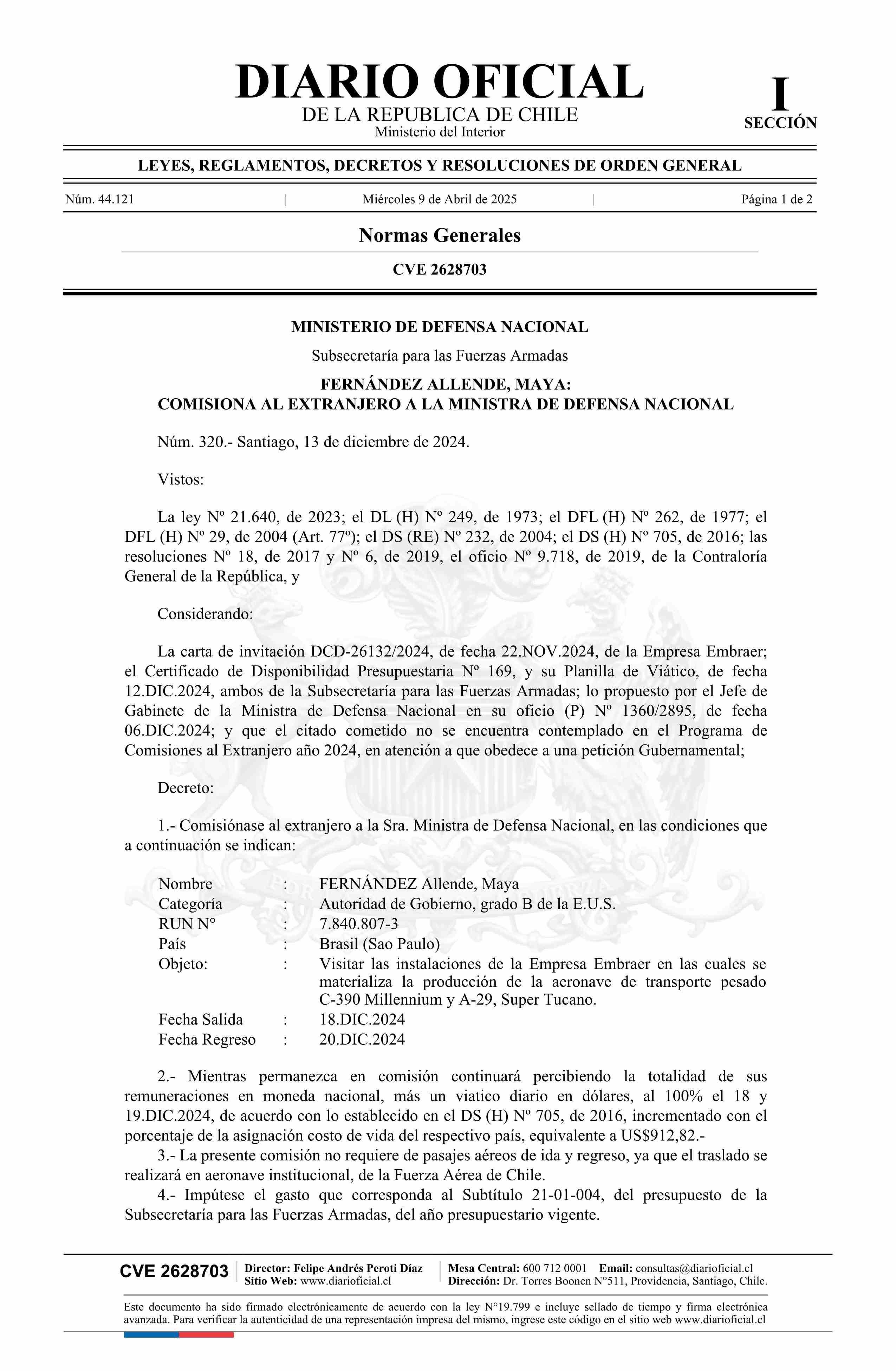 Decreto número 320, de 2024.- Comisiona a doña Maya Fernández Allende, Ministra de Defensa Nacional, a la ciudad de Sao Paulo, Brasil 09-04-2025 DIARIO OFICIAL CHILE - BOLETÍN OFICIAL DE MINERÍA |