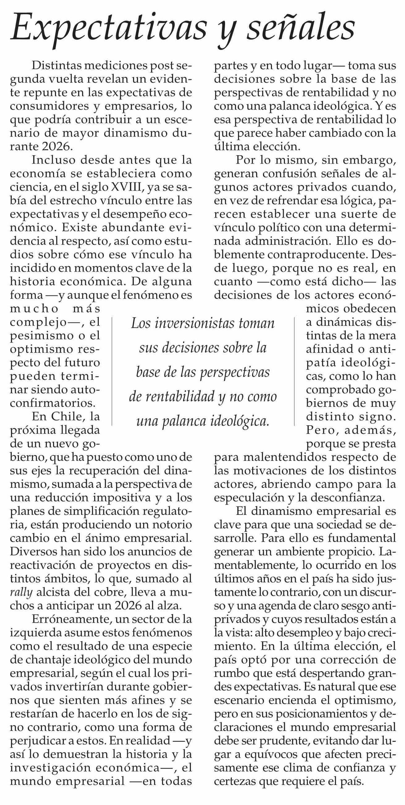 Columnas de Opinión: Expectativas y señales 28-01-2026 El Mercurio |