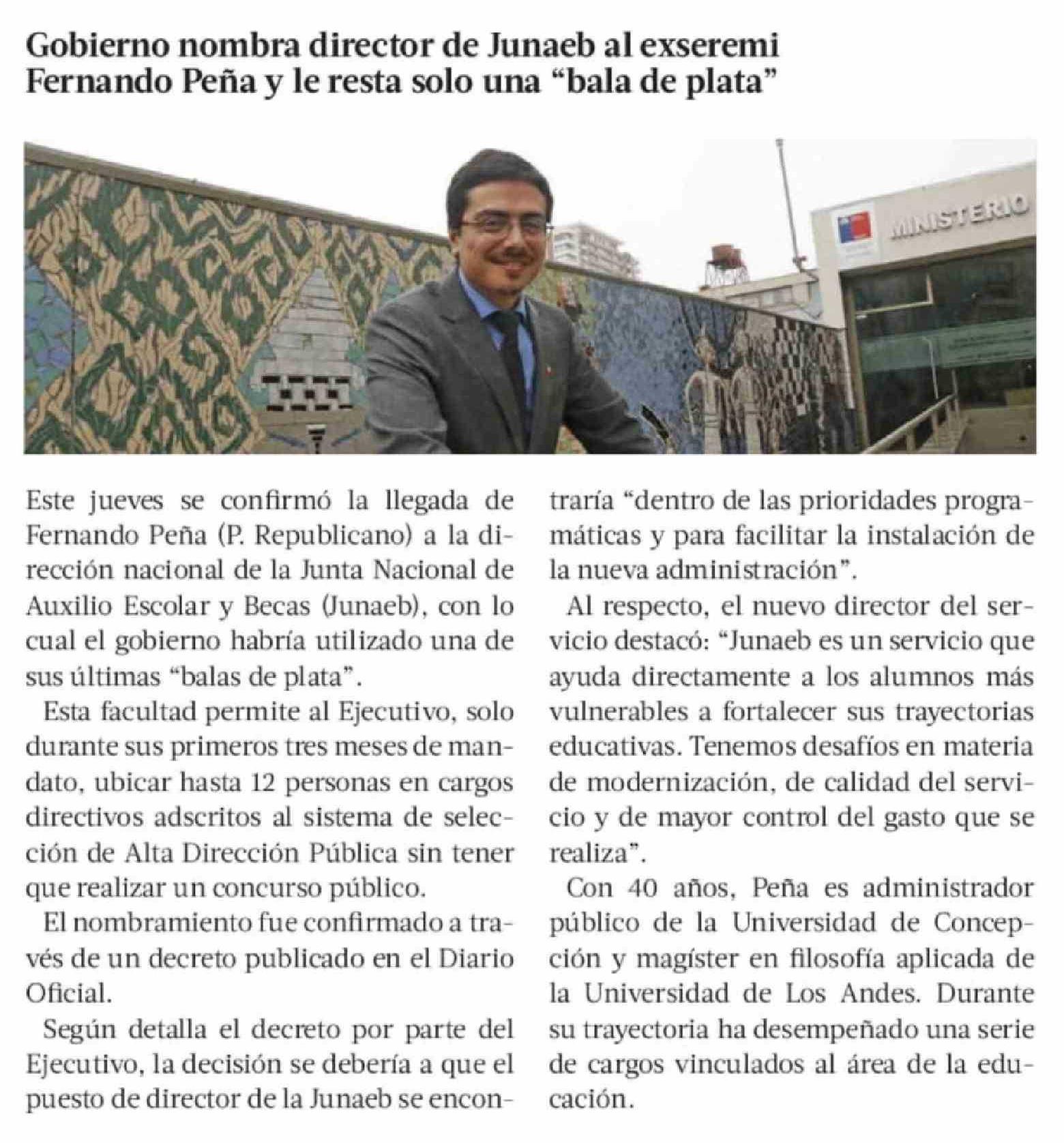 Título: Gobierno nombra director de Junaeb al exseremi Fernando Peña y le resta solo una "bala de plata"